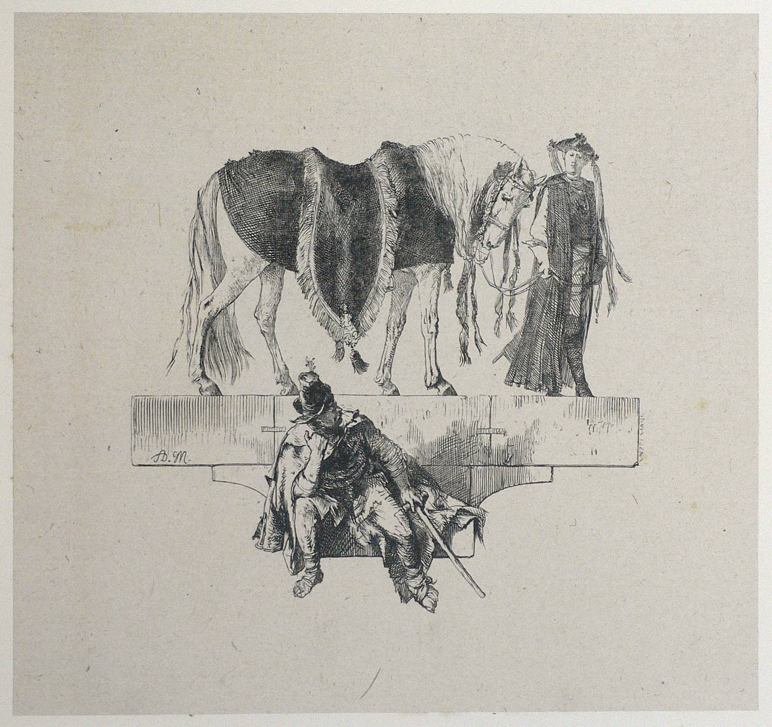 Bock 878 I (von II). – Im Sockel links die Signatur: "A.M.", rechts vertikal: VNZELMANN". – Probedruck vor den Buchausgaben der "Zweihundert Illustrationen zu den Werken Friedrichs des Großen" (1846-57 & 1882). – Hervorragend erhaltenes Blatt.