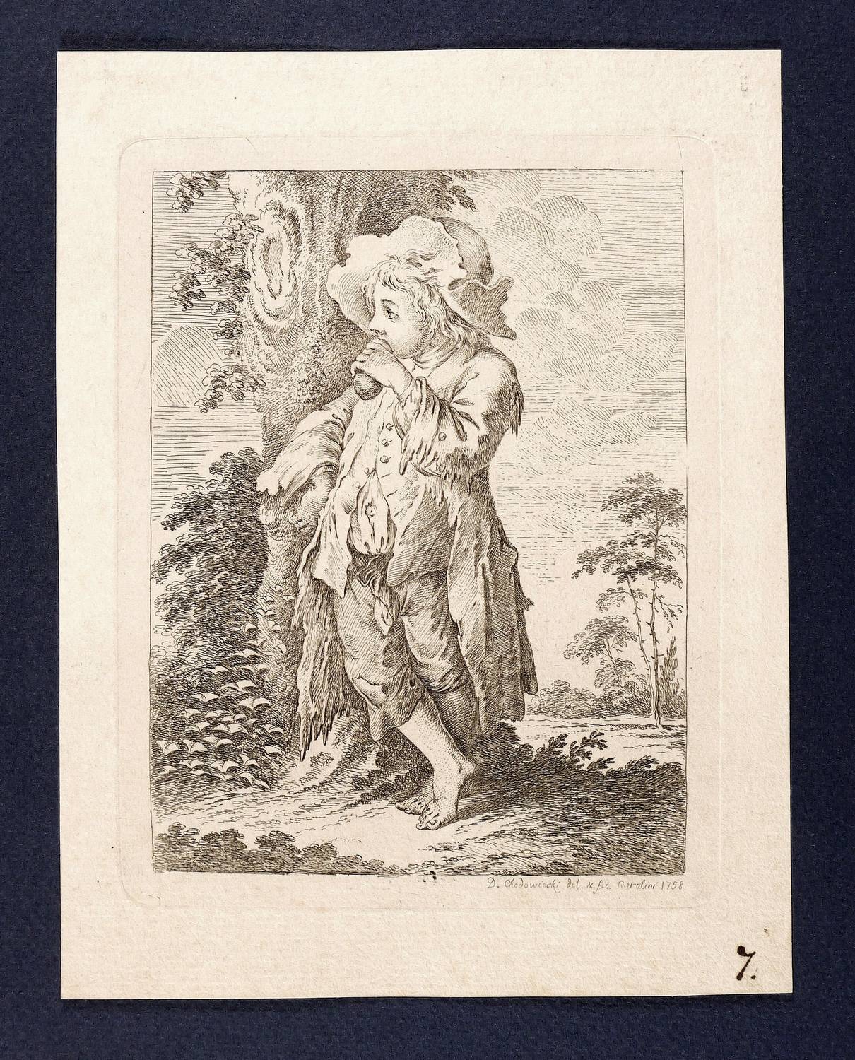 Bauer 9. Engelmann 7. – In der Platte rechts unten signiert und datiert: ″D. Chodowiecki del. & fec. Berolini 1758″. Unter der Platte in brauner Feder Sammlungs-Nr. ″7″. – Diesen Bettlerjungen hat Chodowiecki nach eigener Auskunft im Berliner Tiergarten angetroffen. Für ein geringes Entgelt stand er ihm Modell. Besonders hob er den sonderbar vorstehenden Bauchnabel des Jungen hervor, der durch ein Loch im Hemd zu sehen ist. – Keine Mängel ersichtlich. Sehr guter Zustand.