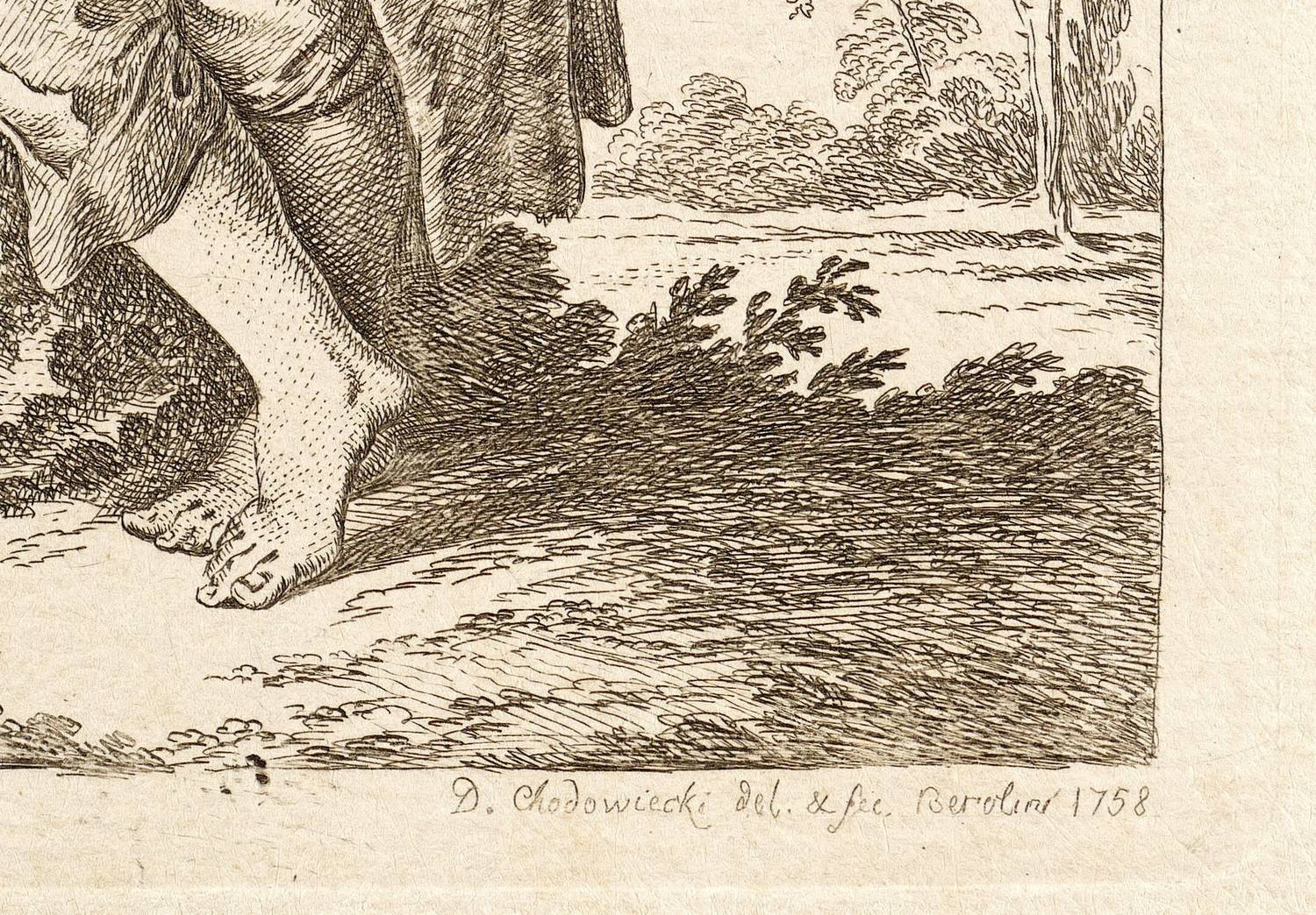 1758. Radierung / Strichätzung, auf kräftigem Bütten. – Originale Künstlergrafik, von Daniel Nikolaus Chodowiecki. – 13,3 x 10,1 cm (Darstellung / Einfassungslinie), 14,6 x 11,3 cm (Platte), 18 x 14 cm (Blatt).
