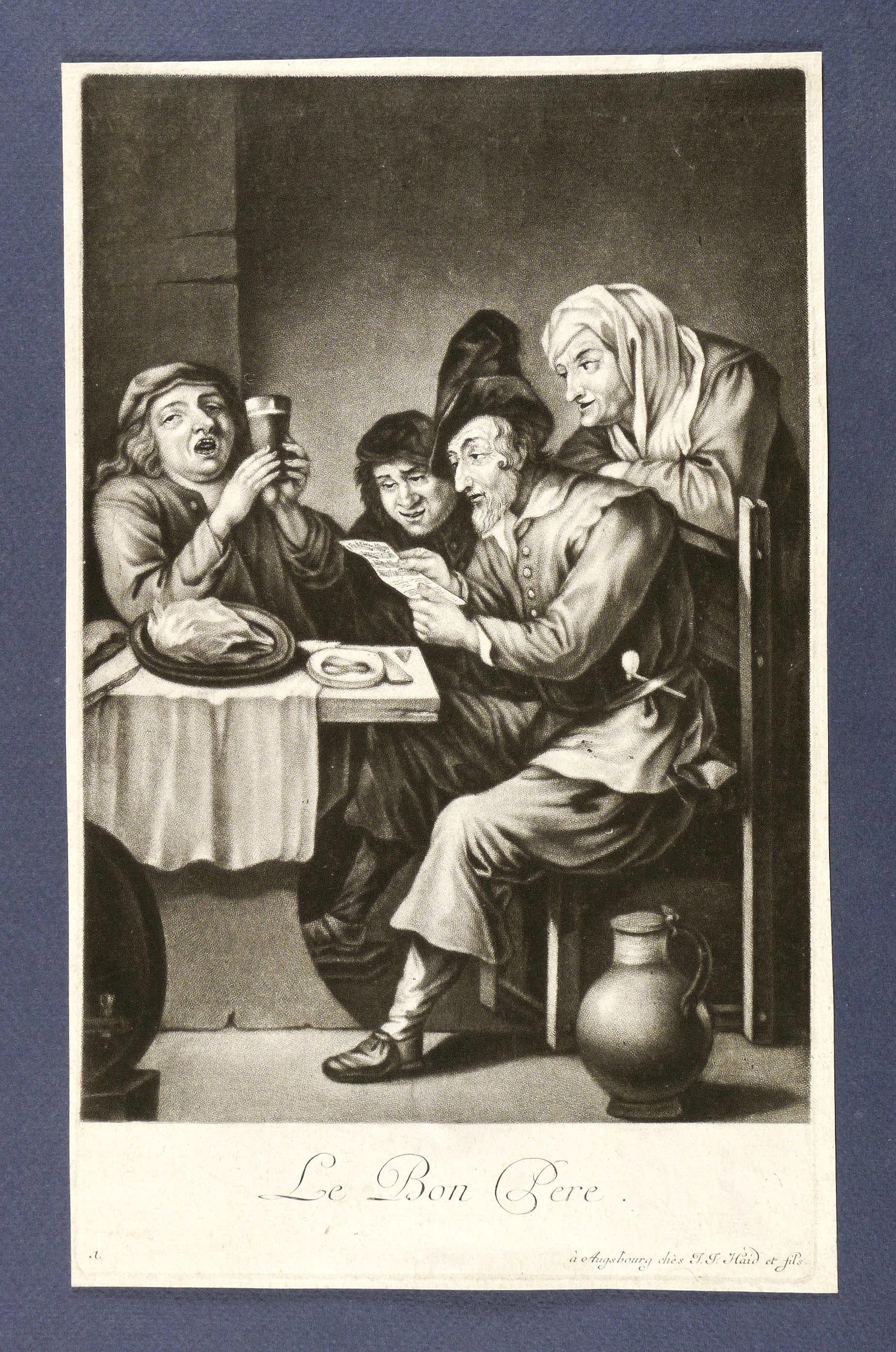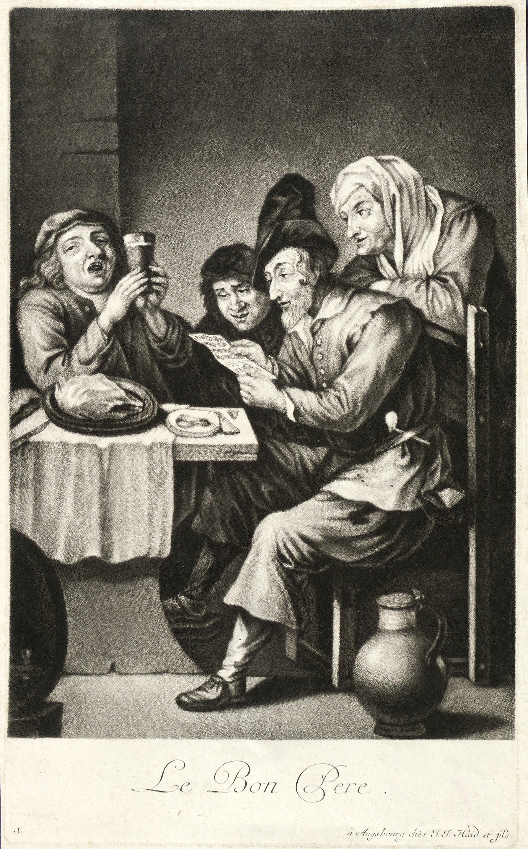 In der Platte unterhalb der Darstellung geschnittener Titel und Verlegeradresse: ″a Augsbourg chez J.J. Haid et fils″. Verso Sammlerstempel: ″leymann″. – An einem Tisch im Wirtshaus scharen sich Leute um ein Notenblatt. - Gibt die Szene aus dem vorbildliche Gemälde von Teniers ausschnitthaft auf die Figuren um das Notenblatt fokussiert wieder. – Schmaler Rand um die Platte. Verso ausgedünnte Partie. Insgesamt guter Zustand.