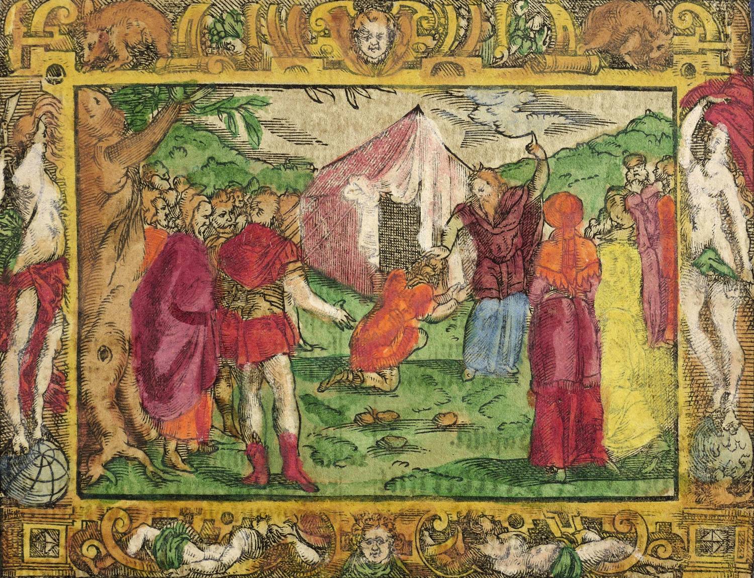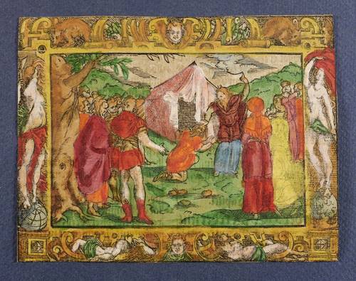 1560-1580. Holzschnitt, alt koloriert. – Historische Buchillustration, von Monogrammist MT. – 7,7 x 11,1 cm (Darstellung / ohne Schmuckrahmen), 10,8 x 14,0 cm (Blatt).
