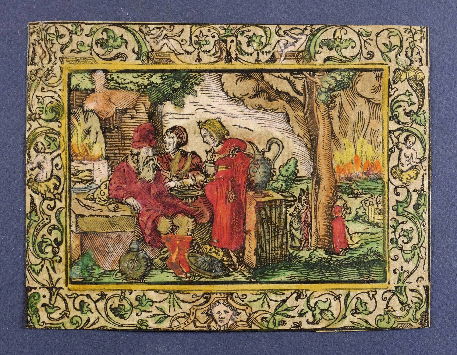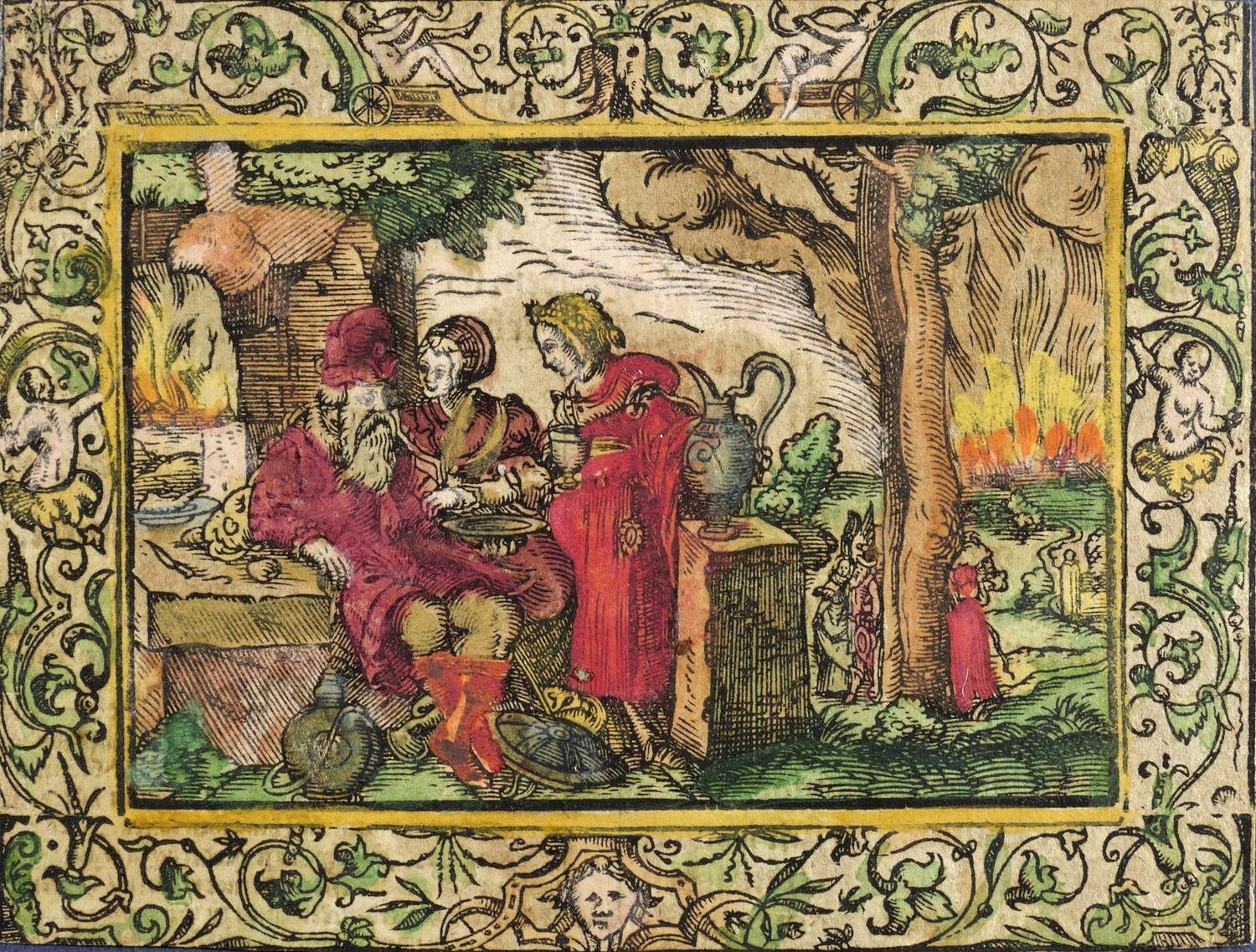 1560-1580. Holzschnitt, alt koloriert. – Historische Buchillustration, von Monogrammist MT. – 7,7 x 11,4 cm (Darstellung / ohne Schmuckrahmen), 11,1 x 14,5 cm (Blatt).