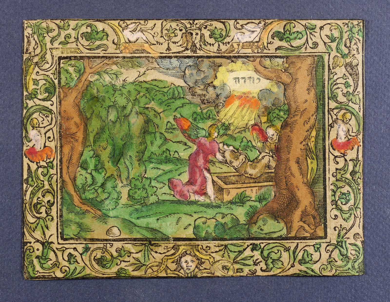Verso typografischer Rückentext aus der Biblia deutsch von Martin Luther. – Zeittypische Bordüre mit Rollwerk, Putten und zwei weiblichen Genien. - Aus einer deutschen Ausgabe der Lutherbibel der 2. Hälfte des 16. Jahrhunderts. Sämtliche Holzschnitte wohl von einer Hand, oft Bilderfindungen des Virgil Solis folgend, bisweilen mit Monogramm MT und Messerchen signiert. – Bis auf den Rand der Schmuckrahmung beschnitten. Papier altersbedingt etwas gebräunt. Insgesamt gut erhalten.