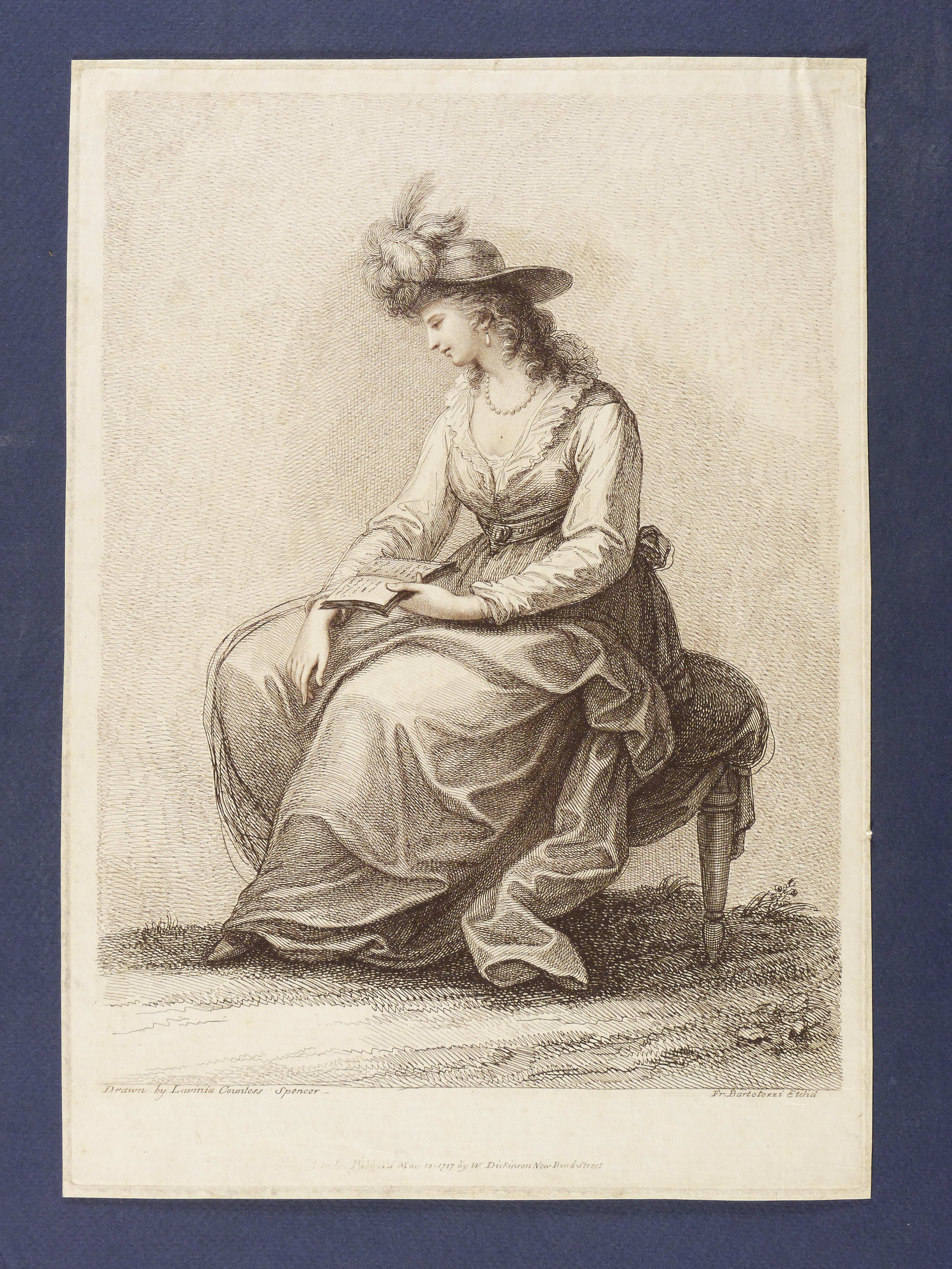 In der Platte rechts unten signiert: ″Fr. Bartolozzi Etchd″. Links bezeichnet: ″Drawn by Lavinia Countess Spencer″. Am unteren Rand Verlagsadresse: ″London. Published May 13. 1787 by W. Dickinson New Bond Street″. – Lavinia Countess Spencer, die selbst die Vorlage für dieses BIldnis von Bartolizzi lieferte, war die Urururgroßmutter von Diana Spencer, Princess of Wales. – Umlaufend knappes Rändchen um die Platte. Verso unmerkliche Montagespuren. Insgesamt guter Zustand.