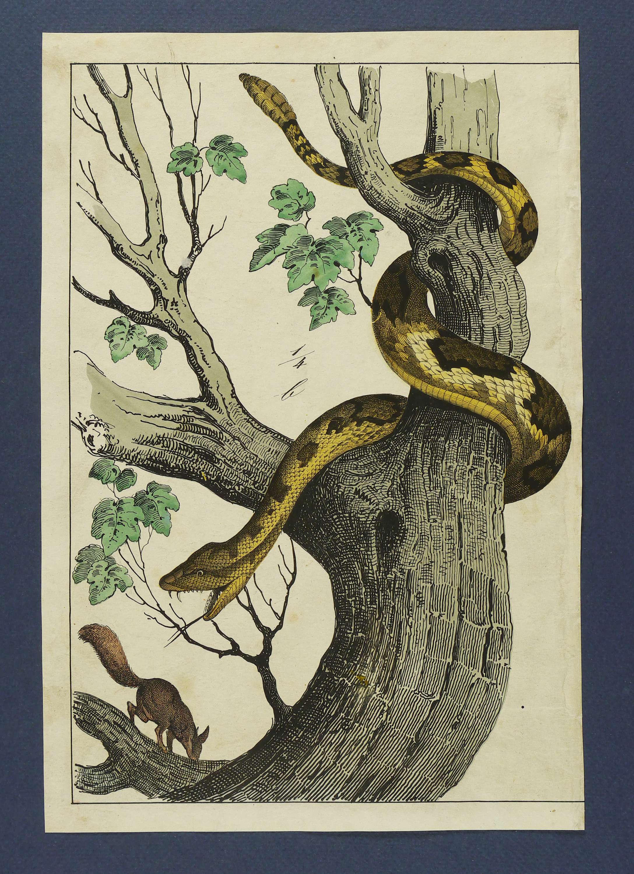 Reptilien. - Schlangen. – Klapperschlange mit Eichhörnchen. – Schubert.