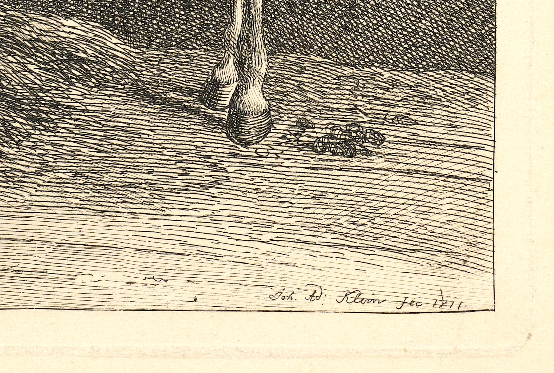 Johann Adam Klein (1792 Nürnberg - 1875 München). Deutscher Maler und Radierkünstler des Biedermeier. Erster Zeichenunterricht mit 8 Jahren bei dem Maler Georg Christoph von Bemmel. Ab 1805 Lehrling im Atelier des Kupferstechers Ambrosius Gabler. 1811 Schüler der von Gustav Philipp Zwinger geleiteten Nürnberger Zeichenschule. 1811-18 Studium an der Kunstakademie in Wien. Während einer Reise an Rhein und Main 1815 Begegnung mit dem Werk des Malers Wilhelm von Kobell. 1818 Reise ins Salzkammergut mit Johann Christoph Erhard, den Brüdern Friedrich Philipp und Heinrich Reinhold und Ernst Welker. 1819/20 Italienaufenthalt. 1839 Umsiedelung nach München und Heirat der Tochter des Kupferstechers Wolf. Mit seinen zahlreichen Tierstücken zählt Klein zu den wichtigsten Radierkünstlern des frühen 19. Jahrhunderts.