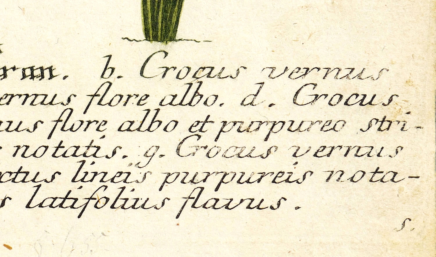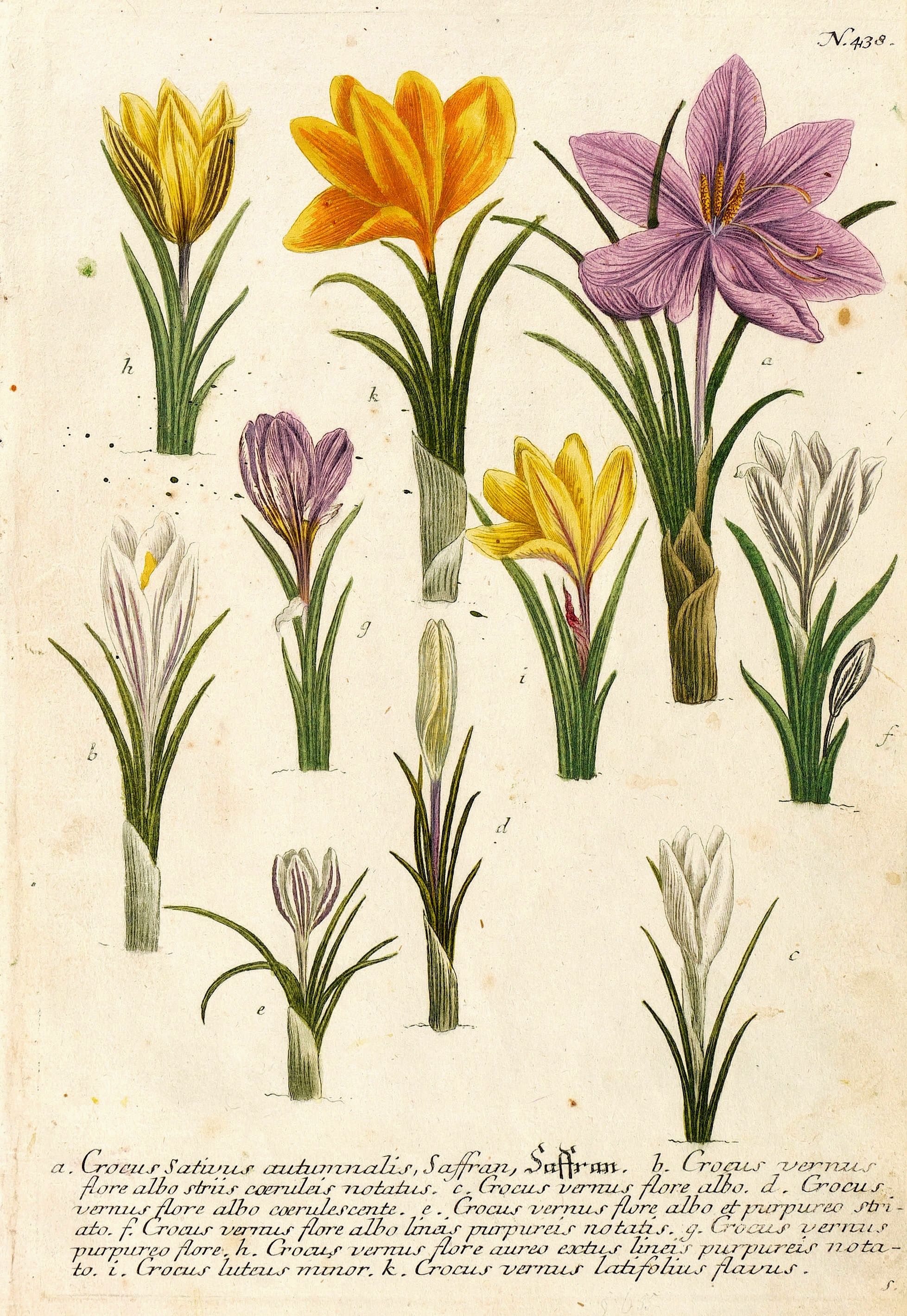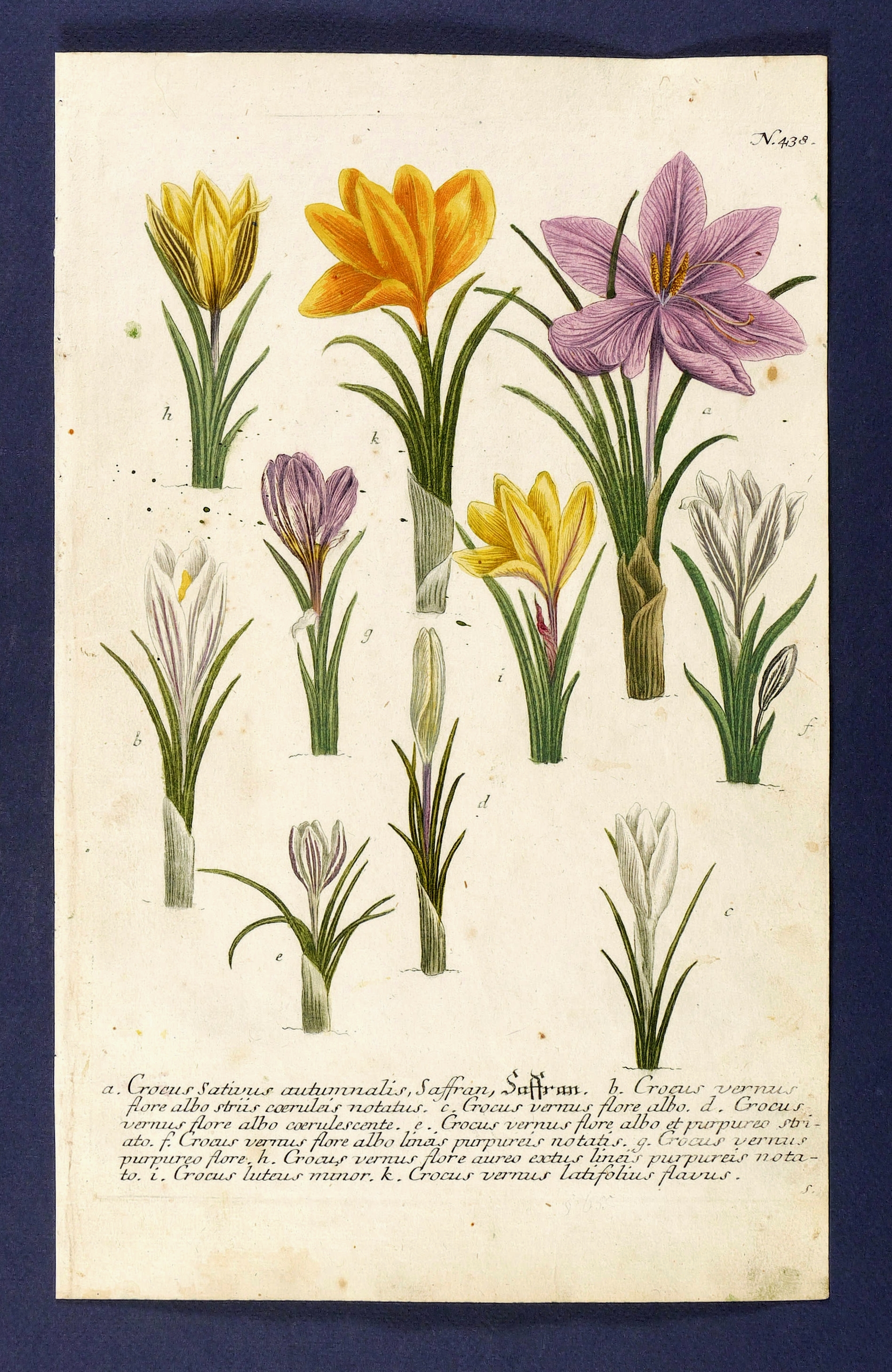 Aus: Johann Wilhelm Weinmann, Phytanthoza-Iconographia Oder Eigentliche Vorstellung Etlicher Tausend, So wohl Einheimisch- als Ausländischer, aus allen vier Welt-Theilen, in Verlauf vieler Jahre (...) gesammelter Pflantzen, Bäume, Stauden, Kräuter, Blumen, Früchten und Schwämme (Regensburg: Hieronymus Lentz 1737-1745), Bd. 2 (1739). – In der Platte rechts unten Signatur, rechts oben Tafel-Nr. "438", unten mittig ausführliche Inschrift: "a. Crocus sativus autumnalis, Saffran, Saffran. b. Crocus vernus flore albo striis coeruleis notatus. c. Crocus vernus flore albo. d. Crocus vernus flore albo coerulescente. e. Crocus vernus flore albo et purpureo striato. f. Crocus vernus flore albo lineis purpureis notatis. g. Crocus vernus purpureo flore. h. Crocus vernus flore aureo extus lineis purpureis notato. i. Crocus luteus minor. k. Crocus vernus latifolius flavus." – Bei der Herstellung der Tafeln arbeiteten die Augsburger Künstler Bartholomäus Seutter, Johann Jakob Haid und Johann Elias Ridinger zusammen. Die Kupfer wurden in einer für die Zeit revolutionären Weise farbig gedruckt und sodann partiell von Hand koloriert. Dabei fand der von Seutter weiterentwickelte Mezzotinto-Farbdruck des Niederländers Johannes Teyler Anwendung. – Das kräftige Büttenpapier etwas stockleckig, im Randbereich angeschmutzt. Kolorit kontrastreich erhalten. Dem Alter entsprechend noch guter Zustand.