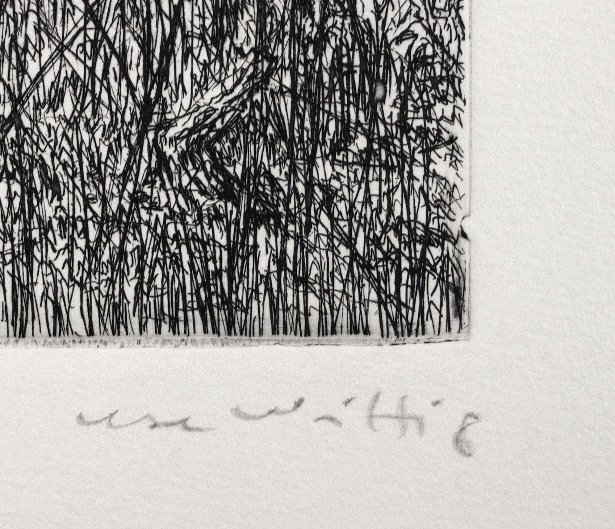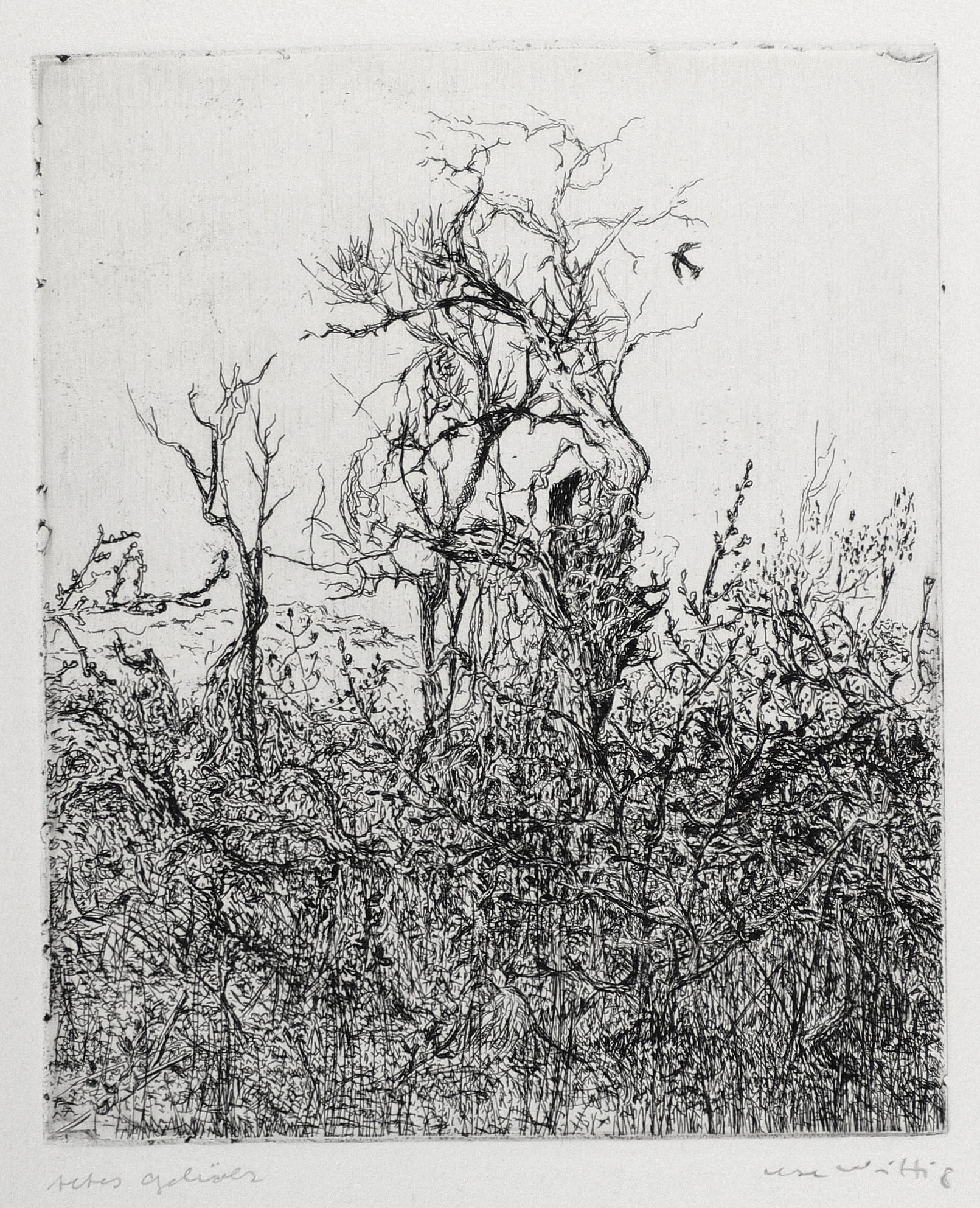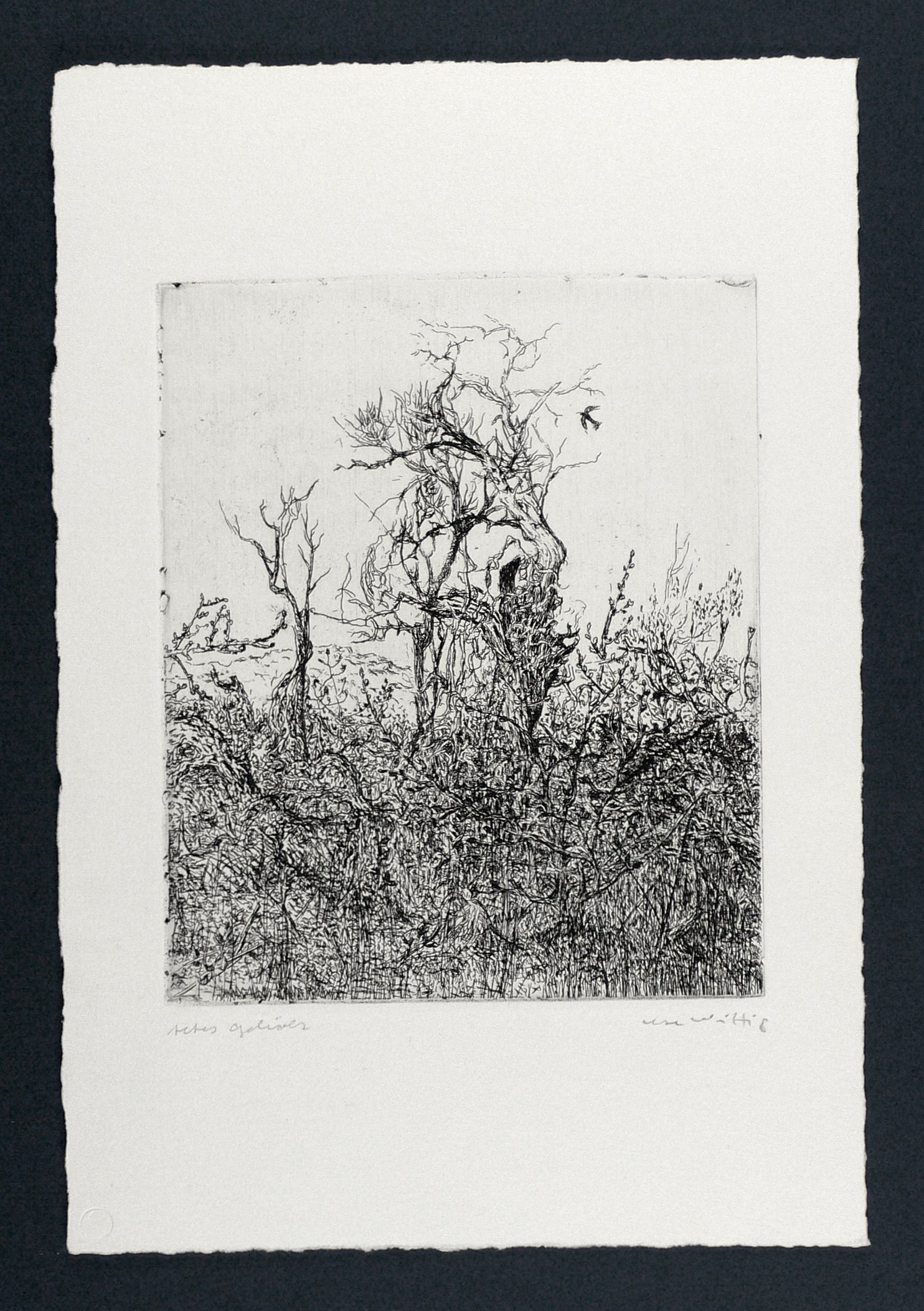 Um 1988. Radierung / Strichätzung, in Schwarz, auf hellchamois Velin. – Originale Künstlergrafik, von Ute Wittig. – 24,0 x 20,0 cm (Darstellung / Platte), 39 x 27 cm (Blatt).