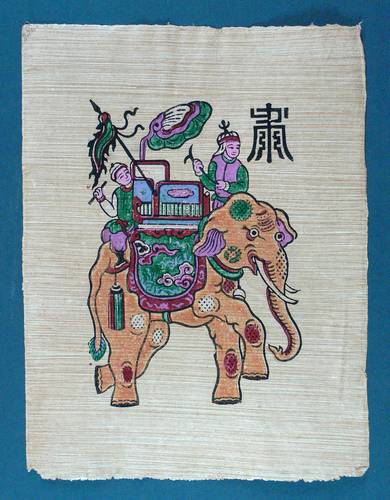 Vietnamesisch. – Tranh Dong Ho. – „Elefant mit zwei Reitern”.