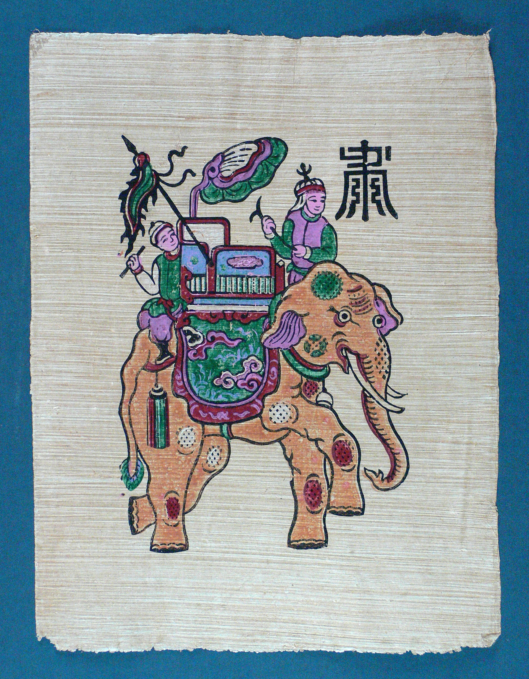 Vietnamesisch. – Tranh Dong Ho. – Elefant mit zwei Reitern.