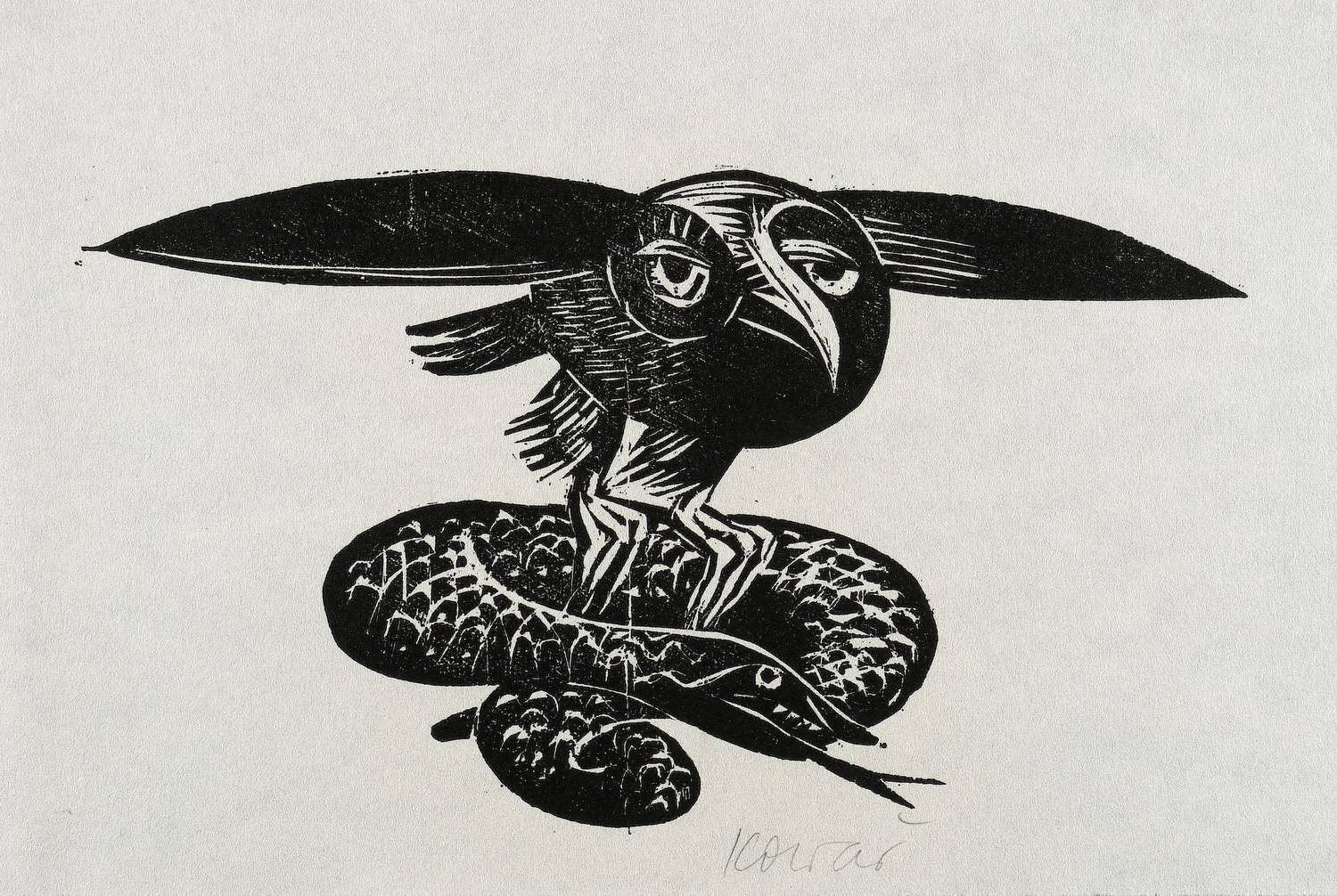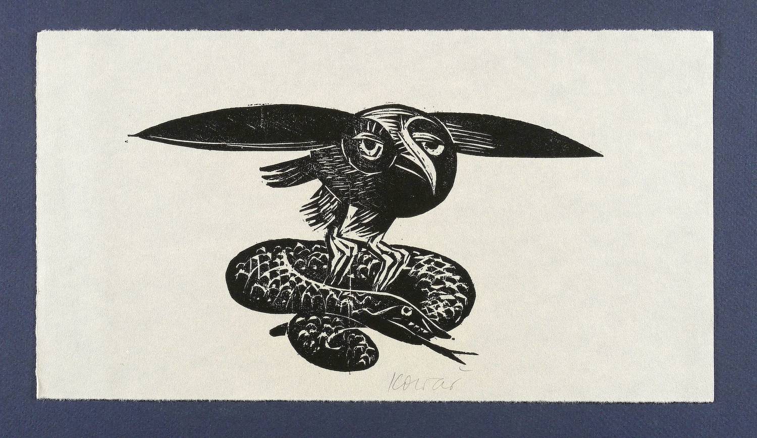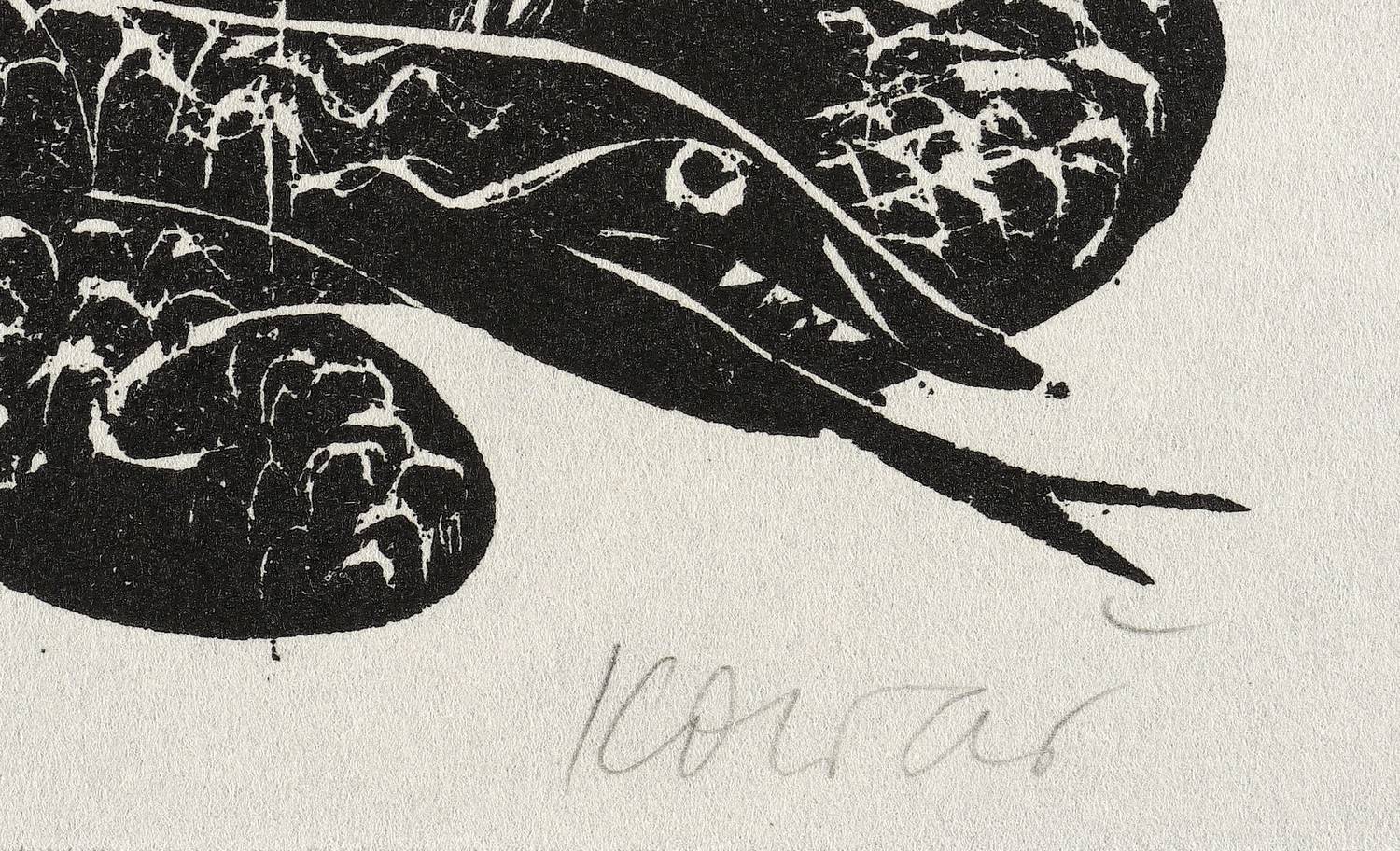 Um 1980. Holzschnitt, in Schwarz, auf rauem leichtem Similijapan. – Originale Künstlergrafik, von Thea Kowar. – 11,7 x 20,6 cm (Darstellung), 16 x 29 cm (Blatt).