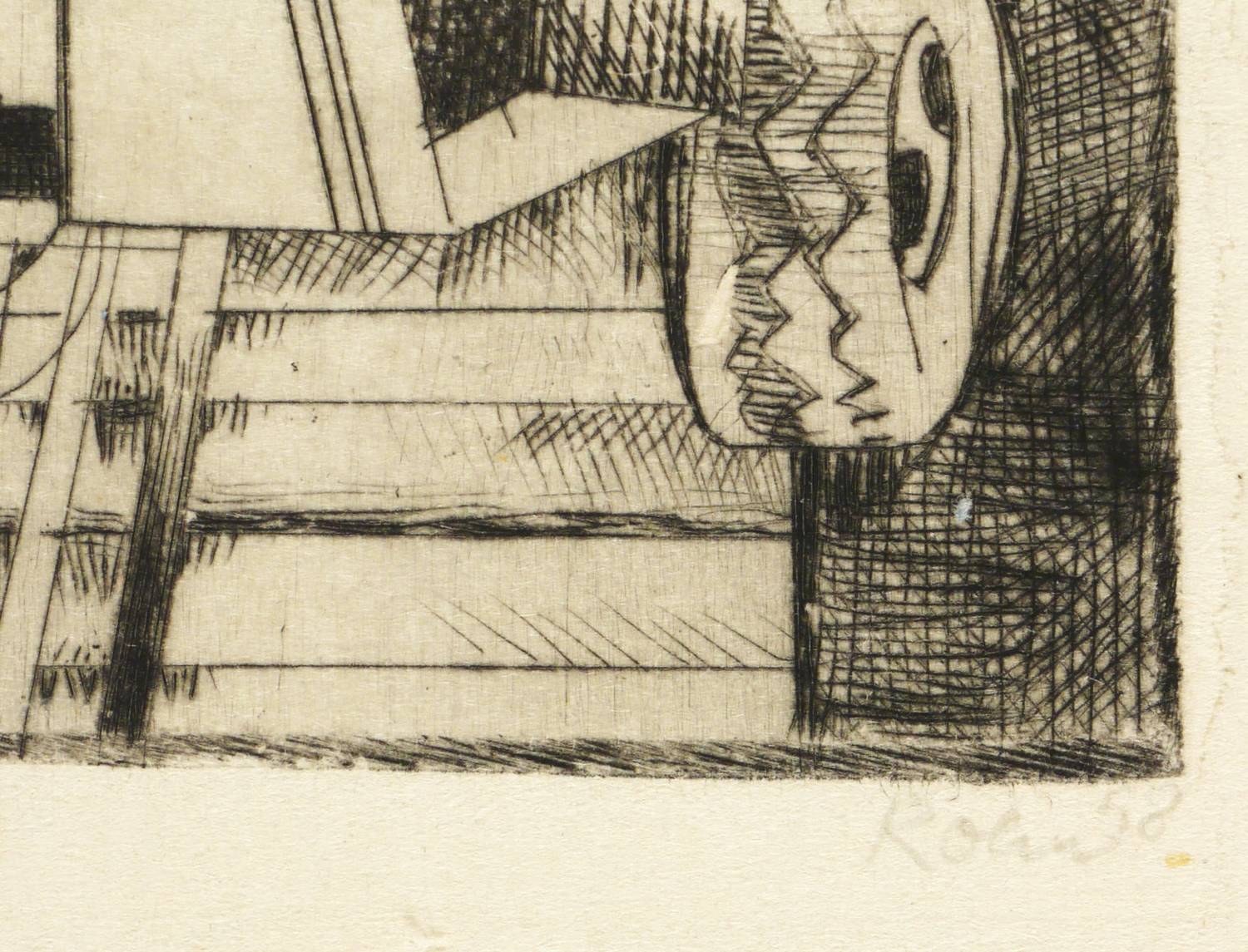 1975. Radierung / Strichätzung, in Schwarz, auf gelblichem Büttenpapier. – Originale Künstlergrafik, von Peter Rohn. – 11,7 x 7,9 cm (Darstellung / Platte), 20 x 15 cm (Blatt).