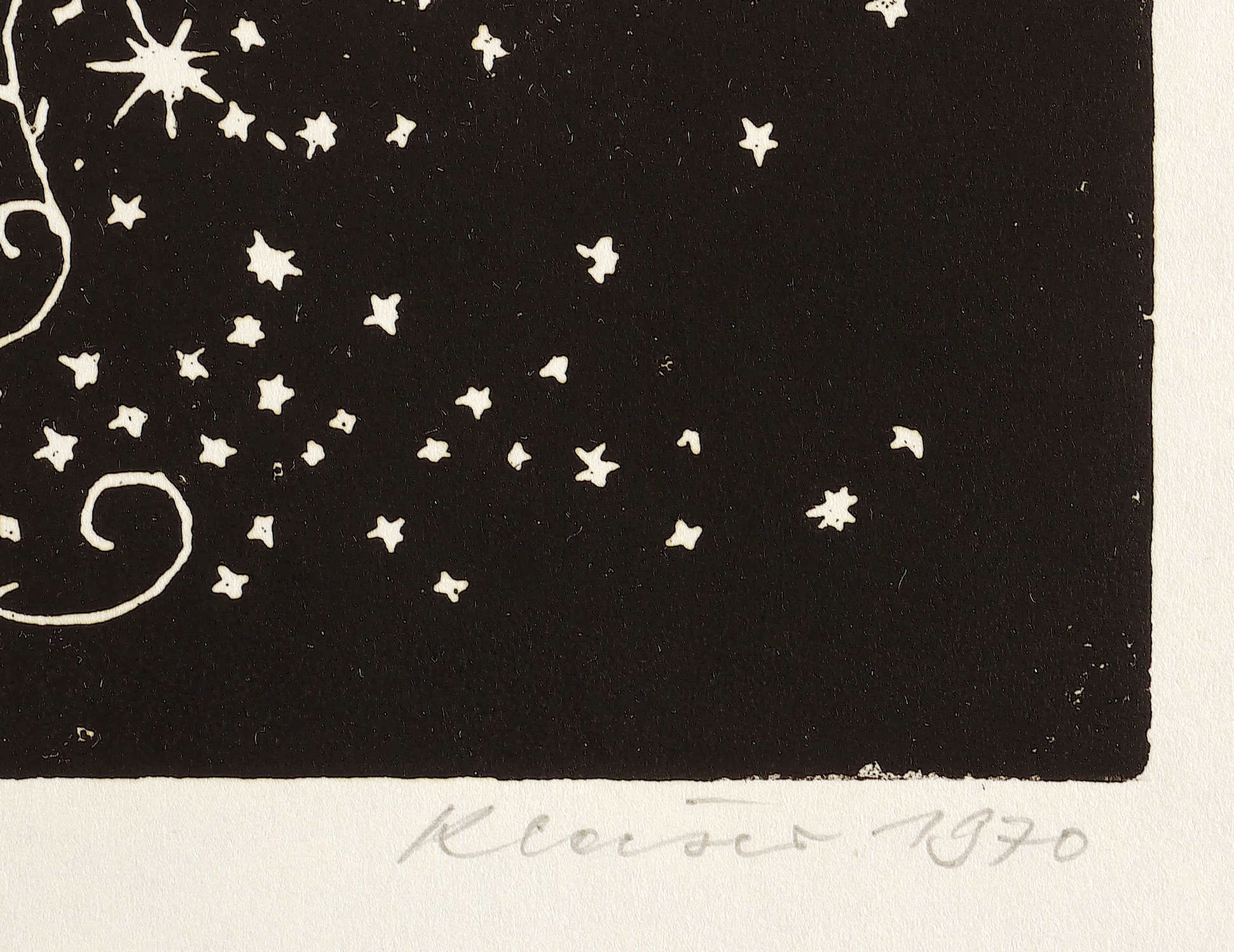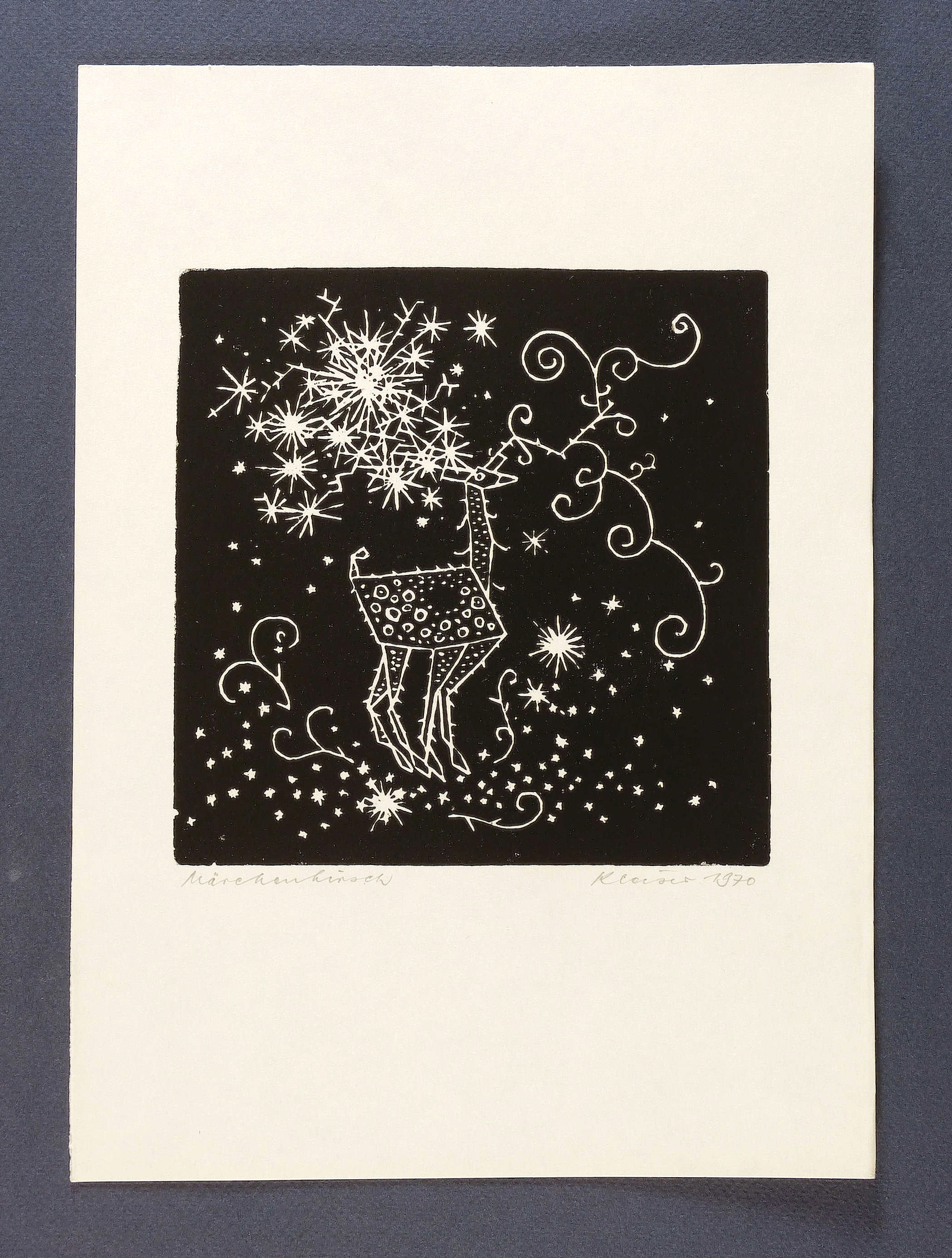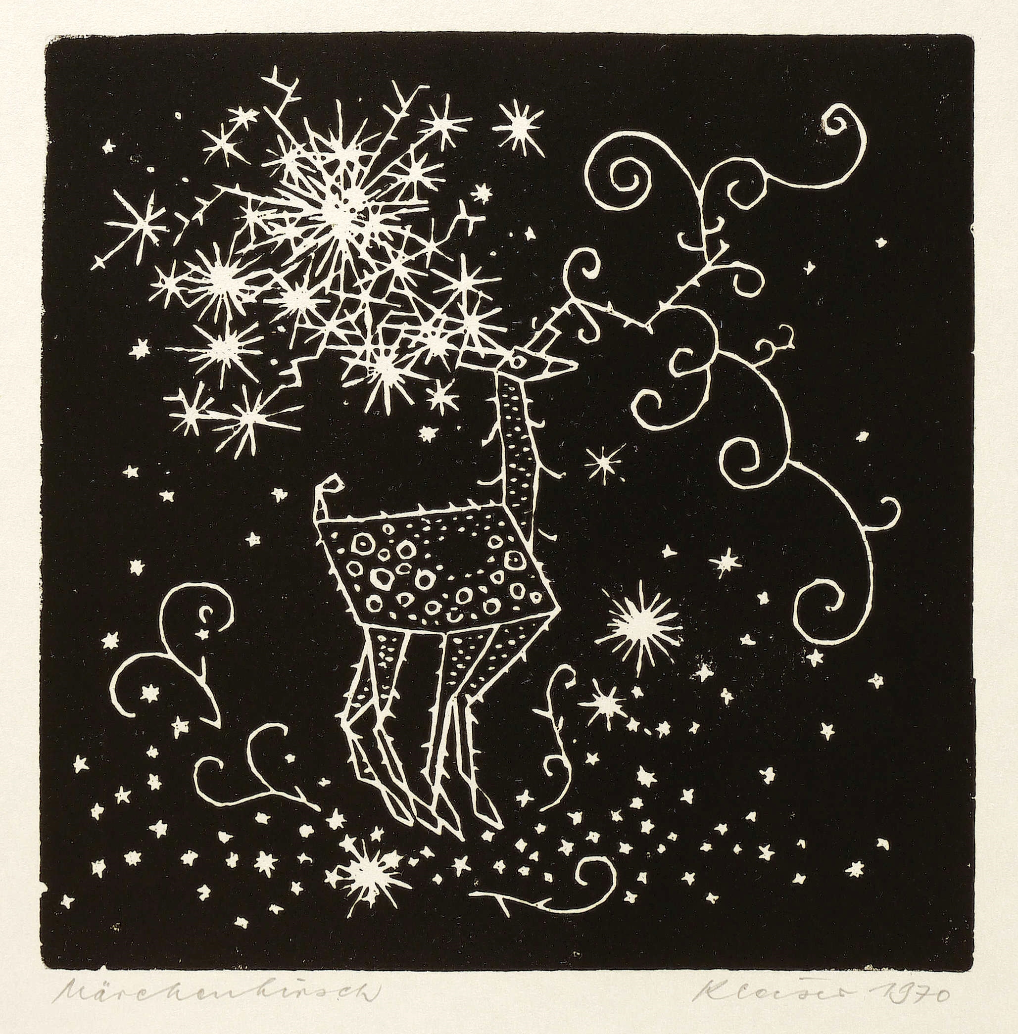 1970. Holzschnitt / Weißlinienschnitt, in Schwarz, auf glattem hellchamois Papier. – Originale Künstlergrafik, von Helmut Kleiser. – 16,0 x 15,8 cm (Darstellung / Druckbild), 30 x 21 cm (Blatt).