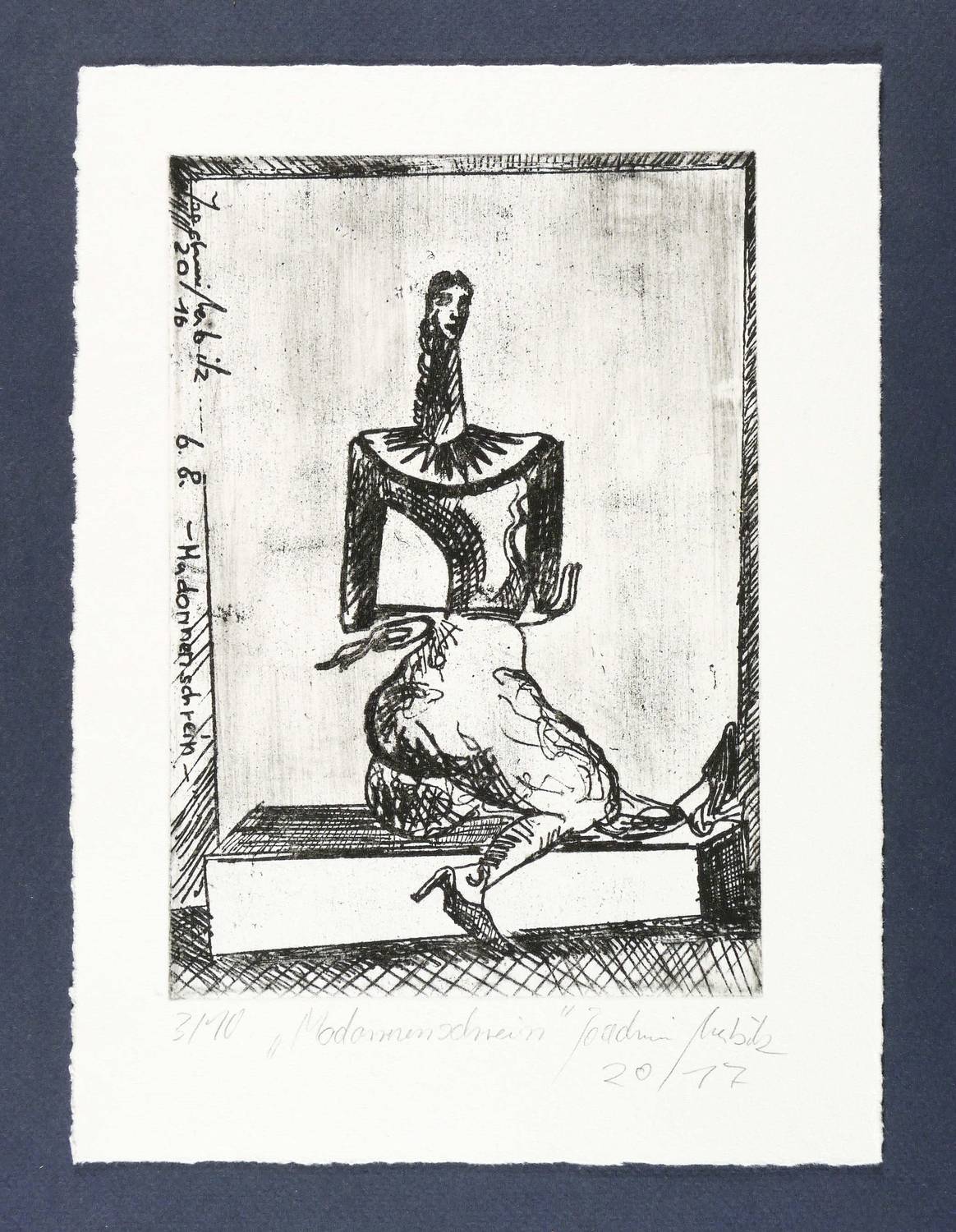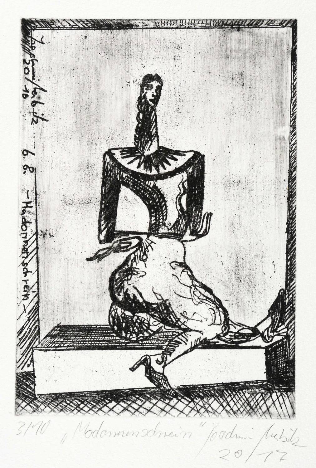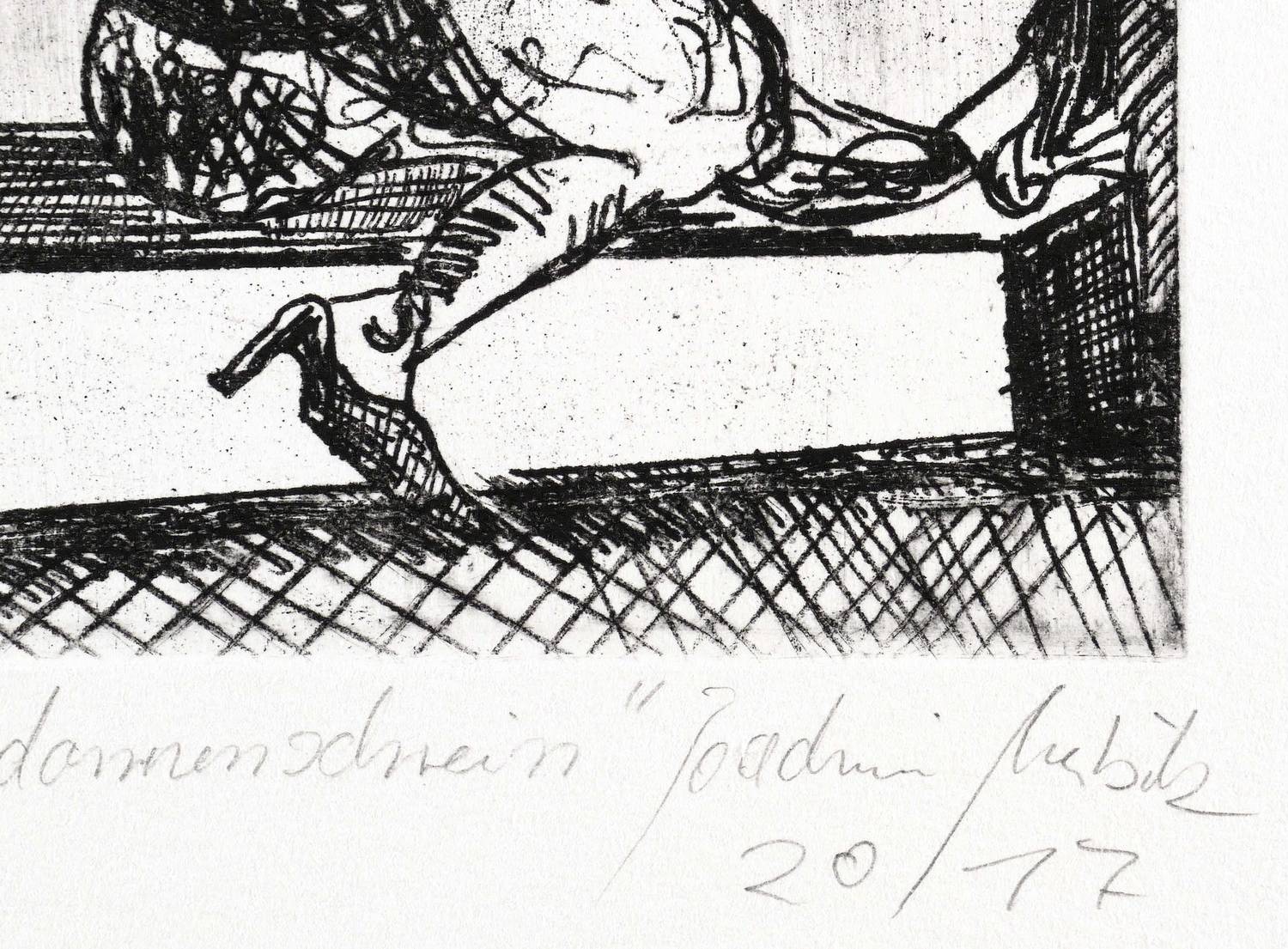 2017. Radierung / Strichätzung, partiell geschliffen, in Schwarz, auf Büttenpapier. – Von Joachim Merbitz. – Auflage Exemplar Nr. 3/10. – 20,6 x 14,4 cm (Darstellung / Platte), 27 x 20 cm (Blatt).