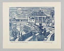 1981. Linolschnitt, in Blau, auf rauem weißem Japan. – Originale Künstlergrafik, von Friedrich Decker. – 14,9 x 19,5 cm (Darstellung), 17,7 x 21,3 cm (Blatt), 21 x 25 cm (Trägerblatt).