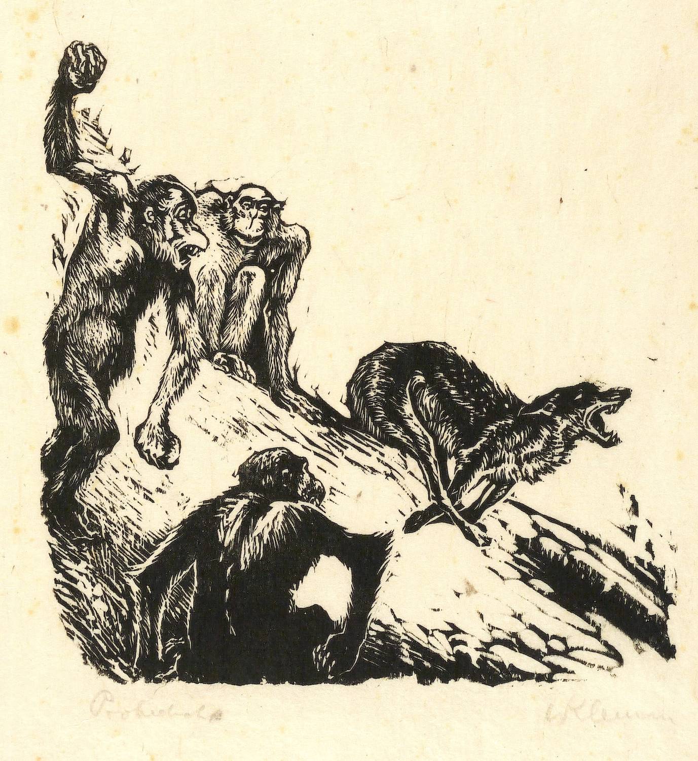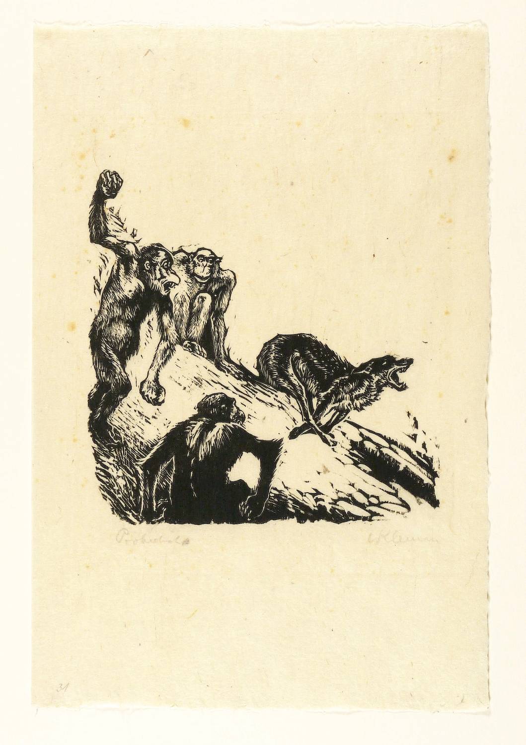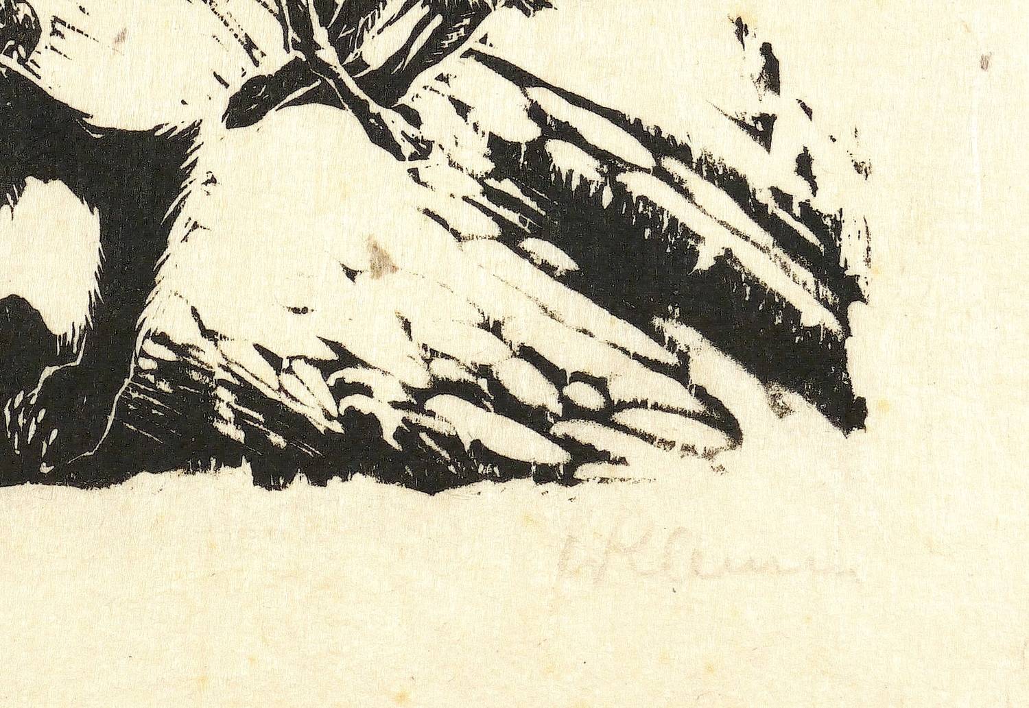 Aus: Johann Wolfgang von Goethe, Reineke Fuchs. Mit Orig.-Holzschn. von Walther Klemm (Weimar: Kiepenheuer 1916). – Rechts unten in Bleistift signiert. Links Auflagenbezeichnung. Links unten nummeriert: ″31″. – Probedruck der originalgrafischen Illustration zu dem 1916 bei Kiepenheuer in Weimar erschienenen ″Reineke Fuchs″ von Goethe mit 45 Holzschnitten von Klemm. – Das originalrandige Papier minimal fleckig. Insgesamt gut erhalten.