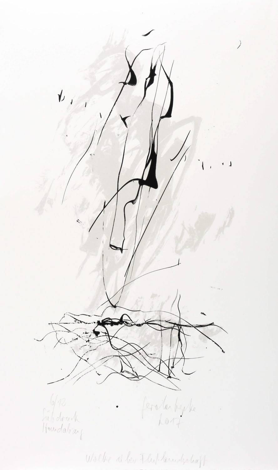 2017. Farbsiebdruck / Farbserigrafie, in hellem Grau & Schwarz, auf feinem weißem Zerkall. – Originale Künstlergrafik, von Gerda Lepke. – Auflage Exemplar Nr. 6/12. – 39,5 x 21,7 cm (Darstellung / Druckbild), 51 x 30 cm (Blatt).