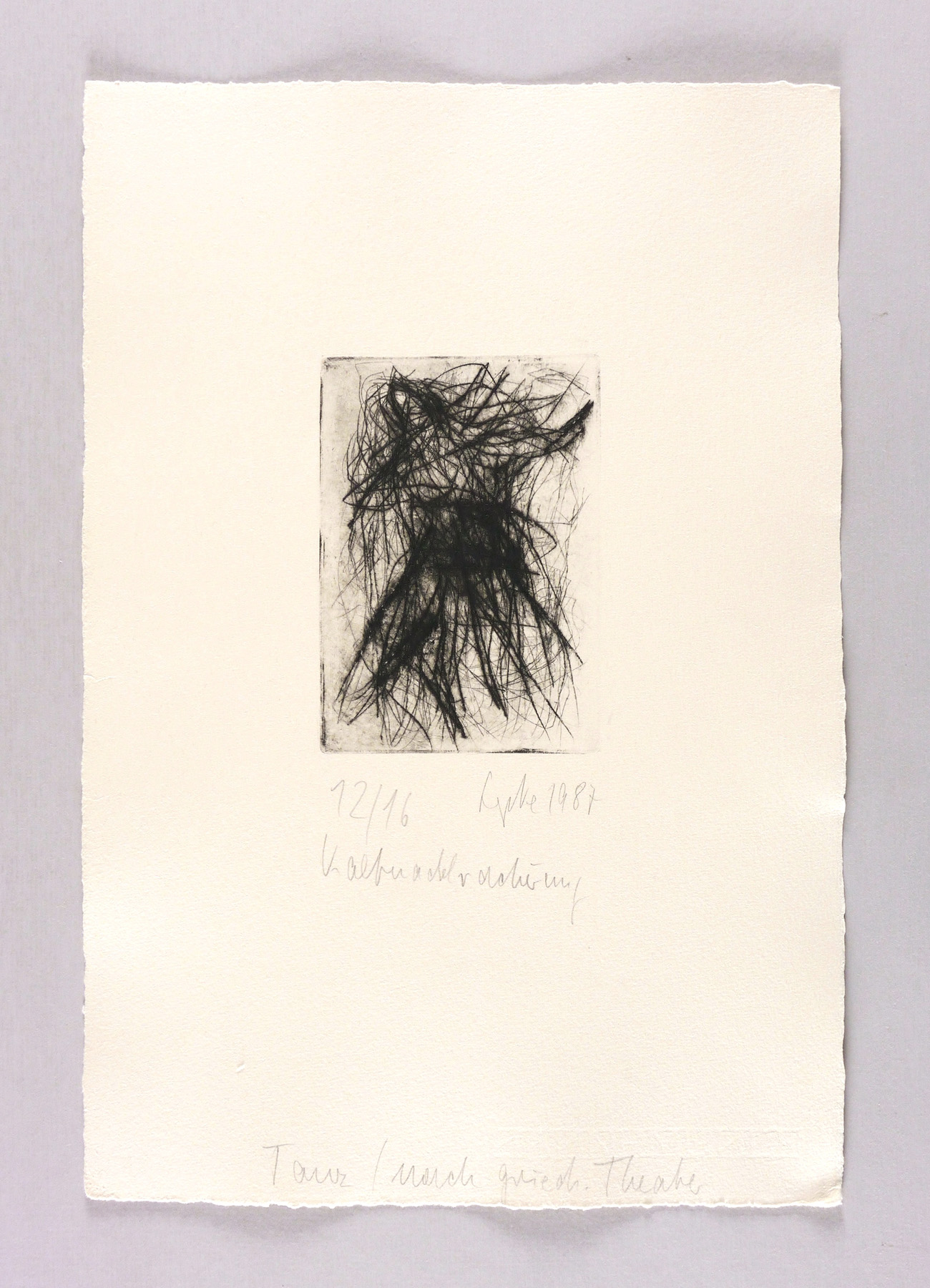Rechts unten in Bleistift signiert und datiert: ″Lepke 1987″. Links Auflagenbezeichnung: ″12/16″. Darunter Technikbezeichnung: ″Kaltnadelradierung″. Im unteren Blattrand Titel: ″Tanz / nach griech. Theater″. Wasserzeichen der Hahnemühle. – Sehr guter Zustand.