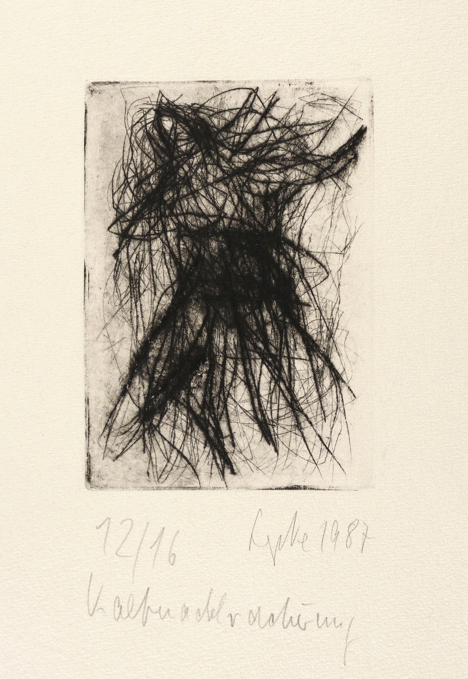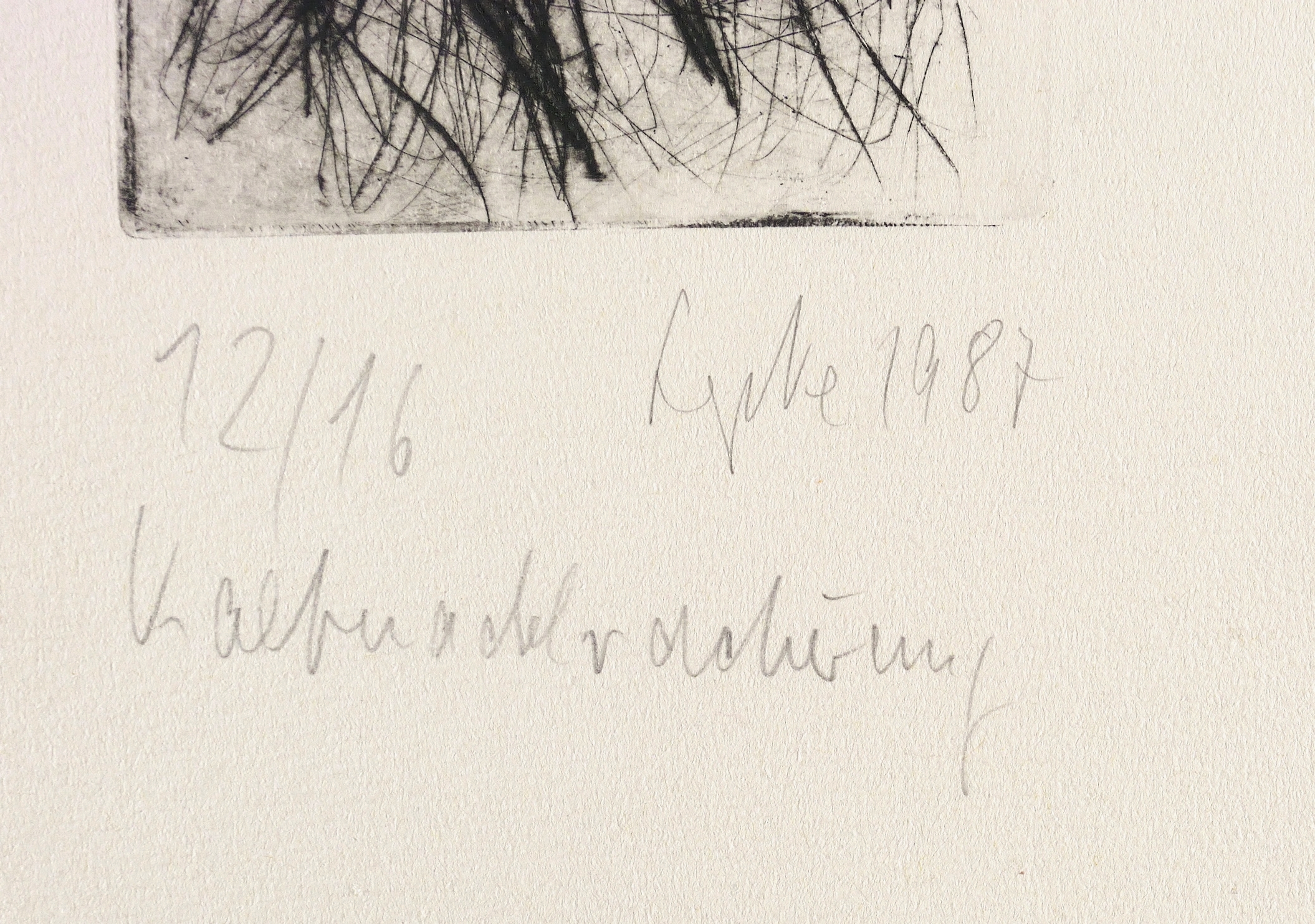 1987. Radierung / Kaltnadel, in Schwarz, auf schwerem chamois Hahnemühle. – Originale Künstlergrafik, von Gerda Lepke. – Auflage Exemplar Nr. 12/16. – 14,0 x 10,0 cm (Darstellung / Platte), 40 x 27 cm (Blatt).