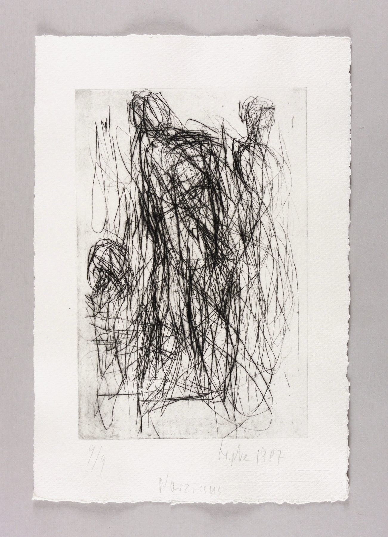 Rechts unten in Bleistift signiert und datiert: ″Lepke 1987″. Links Auflagenbezeichnung: ″9/9″. Darunter Titel: ″Narzissus″. Verso weiter eigenhändig bezeichnet: ″Kaltnadelradierung / Selbstdruck″. Wasserzeichen der Hahnemühle. – Selten. – Sehr guter Zustand.