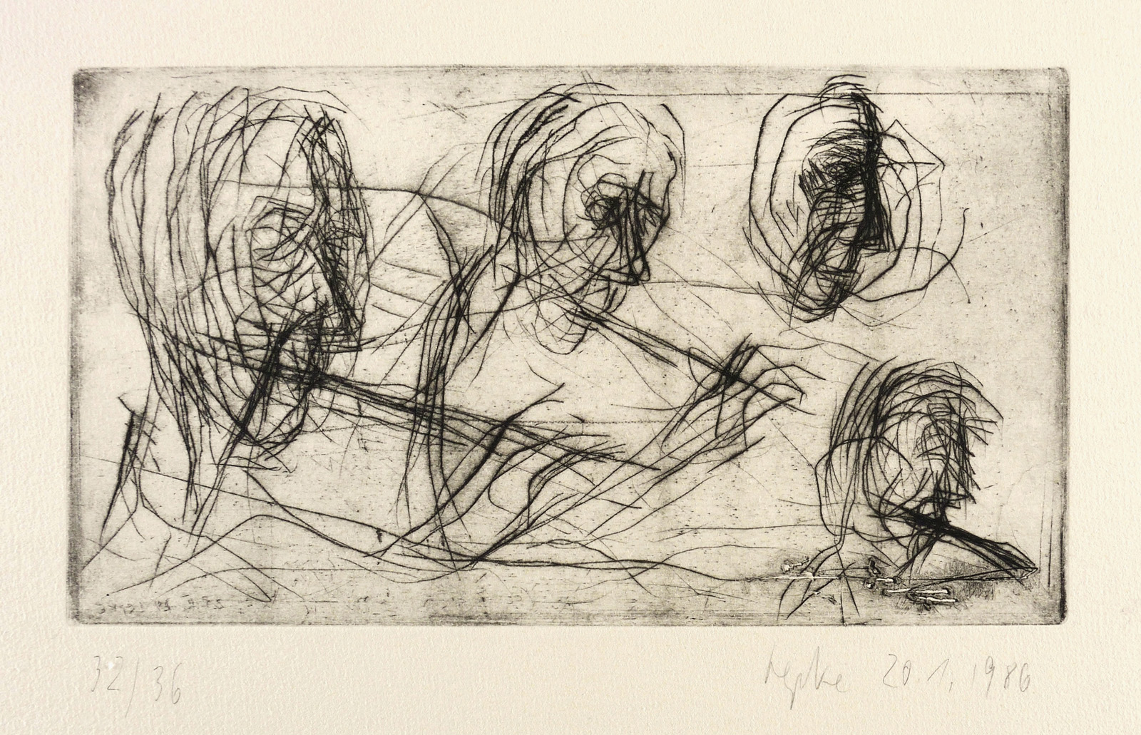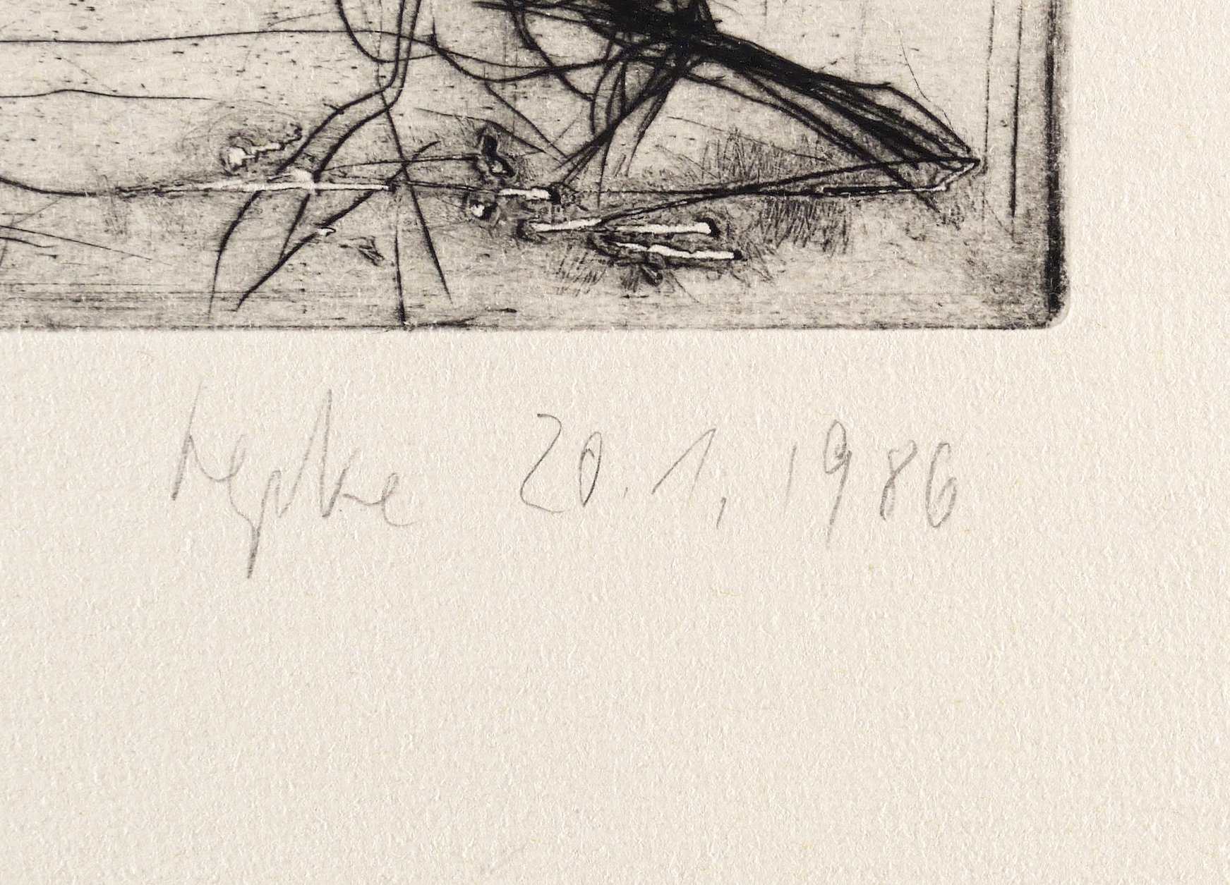 1986. Radierung / Kaltnadel, in Schwarz, auf schwerem chamois Hahnemühle. – Originale Künstlergrafik, von Gerda Lepke. – Auflage Exemplar Nr. 32/36. – 14,5 x 25,7 cm (Darstellung / Platte), 27 x 40 cm (Blatt).
