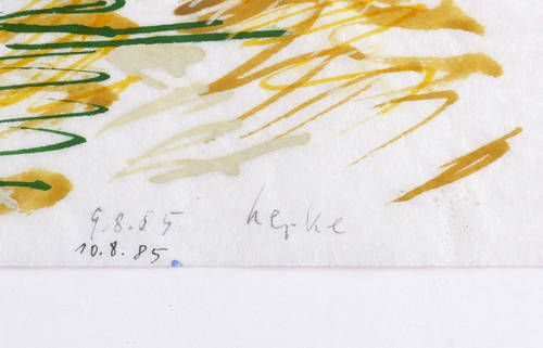 9./10.8.1985. Mischtechnik / Aquarell, mit Tusche, auf Seidenpapier. – Originale Künstlergrafik, von Gerda Lepke. – Unikat. – 36,3 x 52,2 cm (Darstellung / Blatt).
