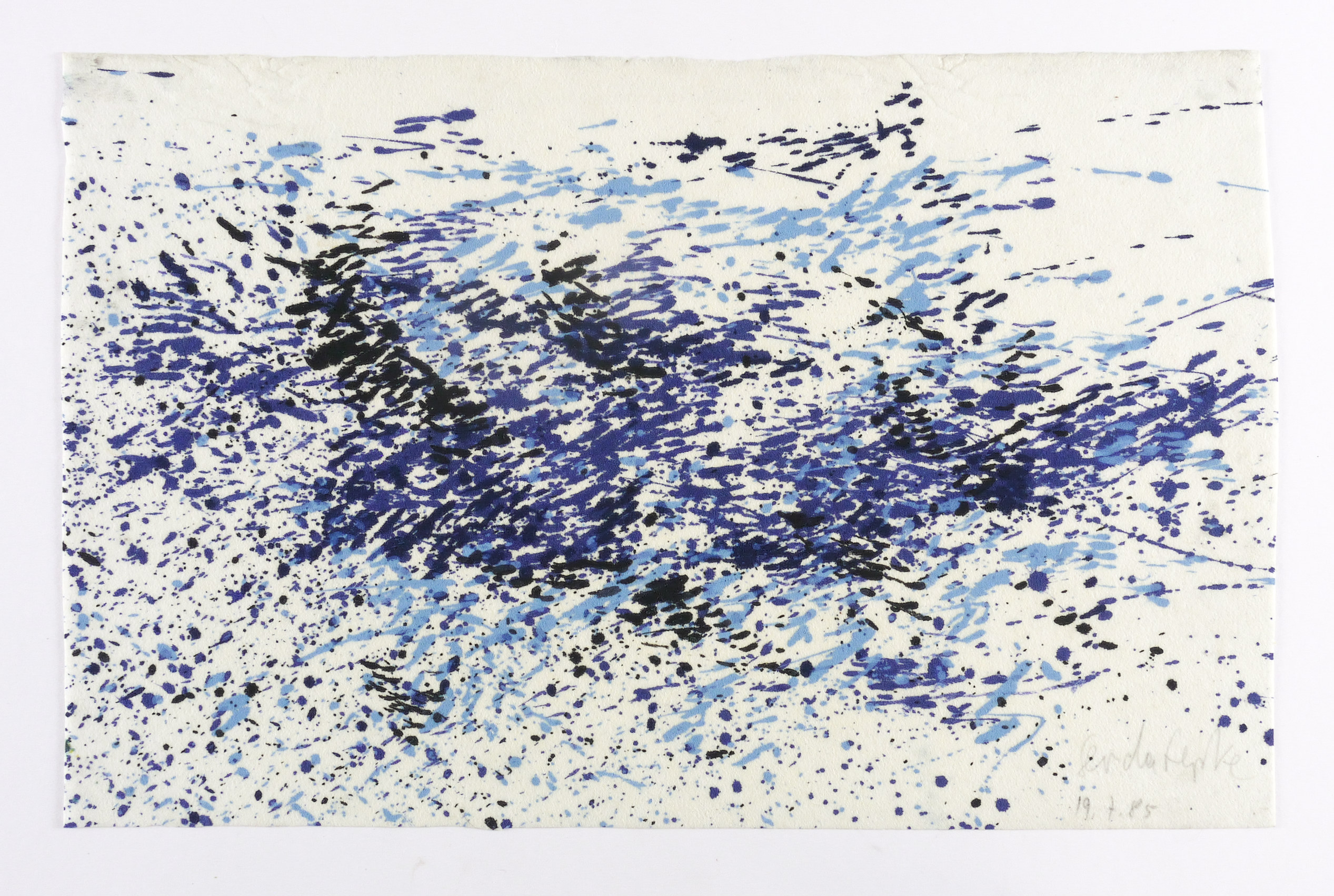 19.7.1985. Mischtechnik / Aquarell, mit Tusche, auf Vlies. – Originale Künstlergrafik, von Gerda Lepke. – Unikat. – 31,4 x 49,0 cm (Darstellung / Blatt).