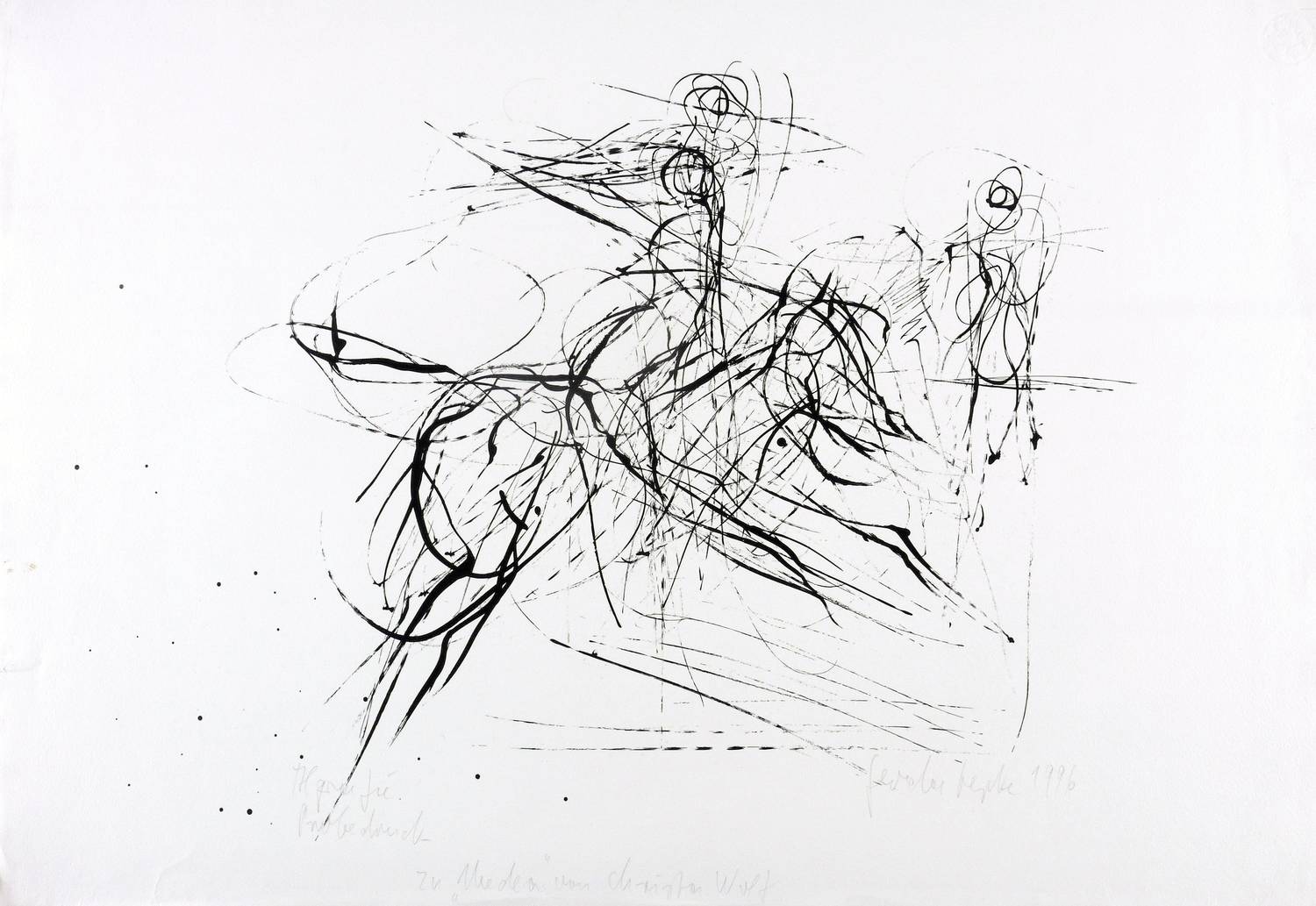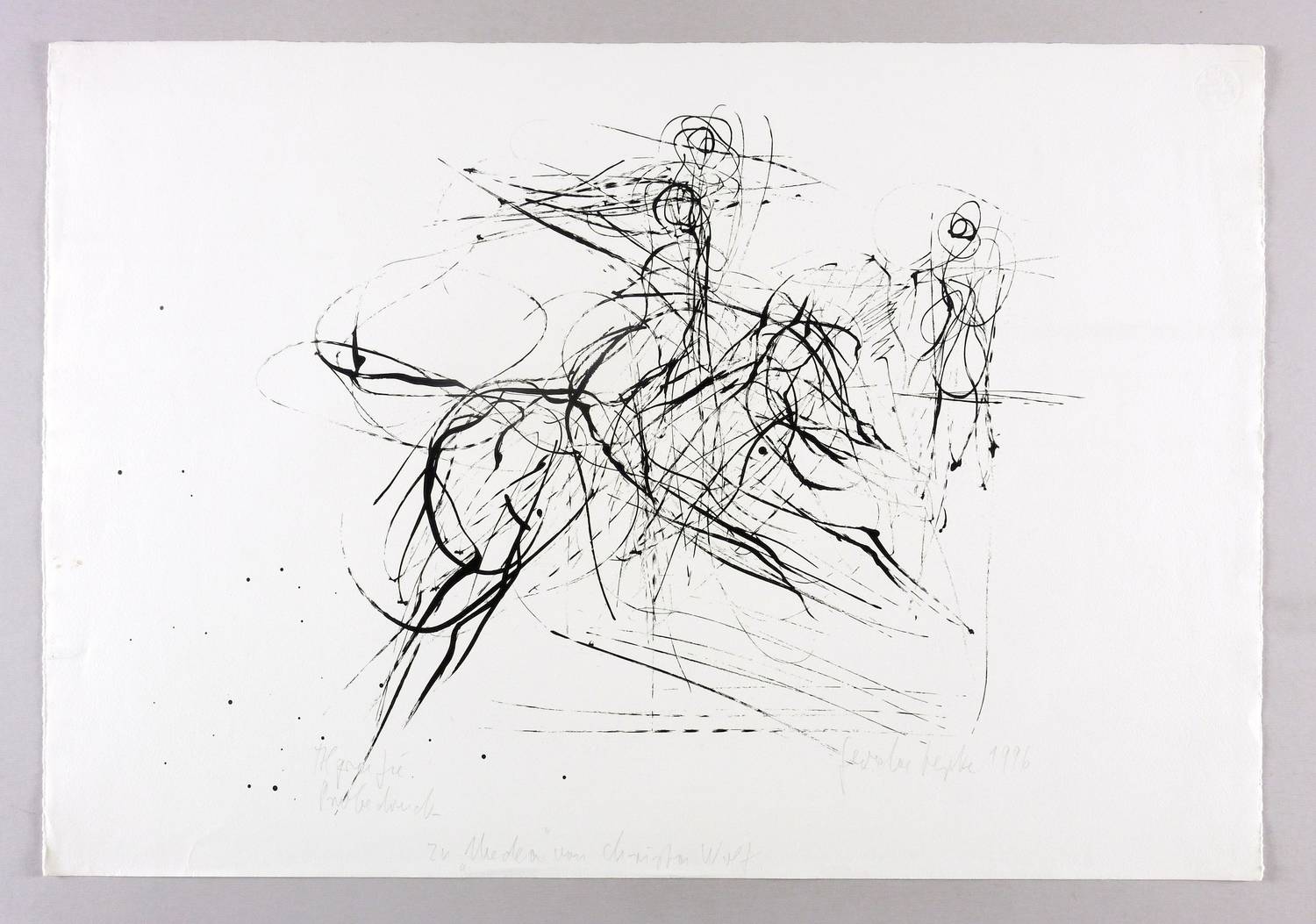 Rechts unten in Bleistift signiert und datiert: ″Gerda Lepke 1996″. Links Auflagen- und Technikbezeichnung: ″Algrafie Probedruck″. Mittig im unteren Rand Titel: ″Zu 'Medea' von Christa Wolf″. Wasserzeichen der Hahnemühle. – Im Rand leichte kaum merkliche Mängel, Griffspuren, Druckstellen und Eselsohr. Noch guter Zustand.