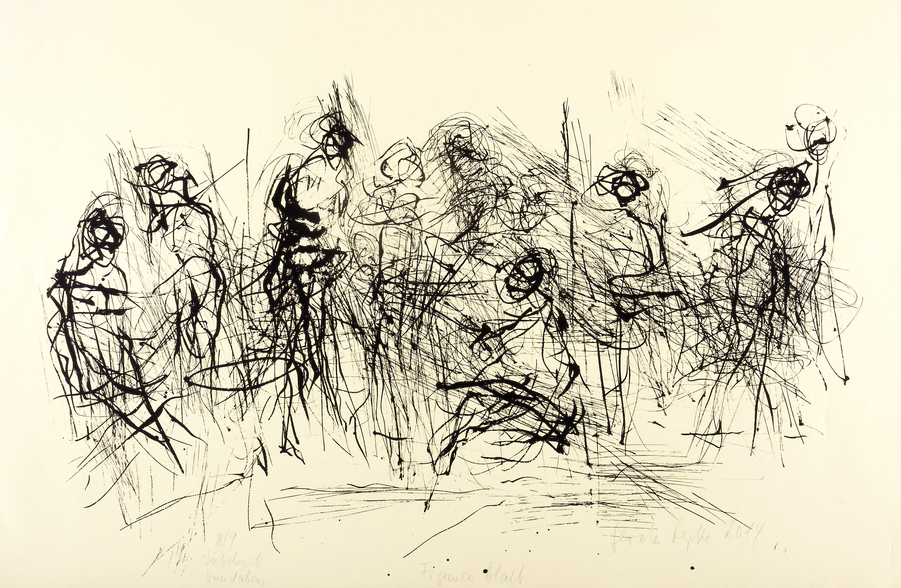 Rechts unten in Bleistift signiert und datiert: ″Gerda Lepke 2014″. Links Auflagen- und Technikbezeichnung: ″8/9 / Siebdruck Handabzug″. Im unteren Blattrand Titel: ″Figurenblatt″. Wasserzeichen von Zerkall. – Kleine Druckstelle im Papier links unten. Sonst guter Zustand.