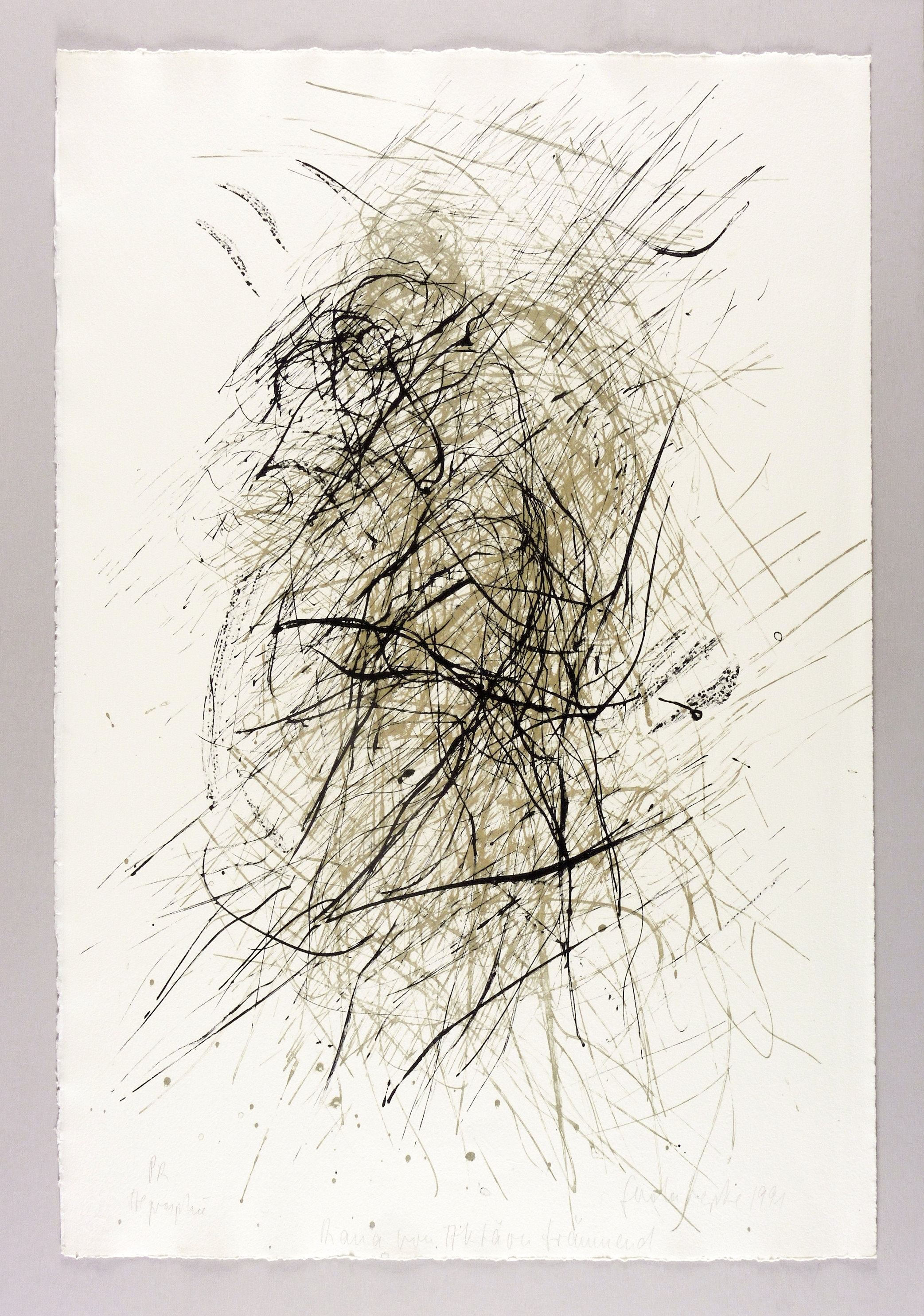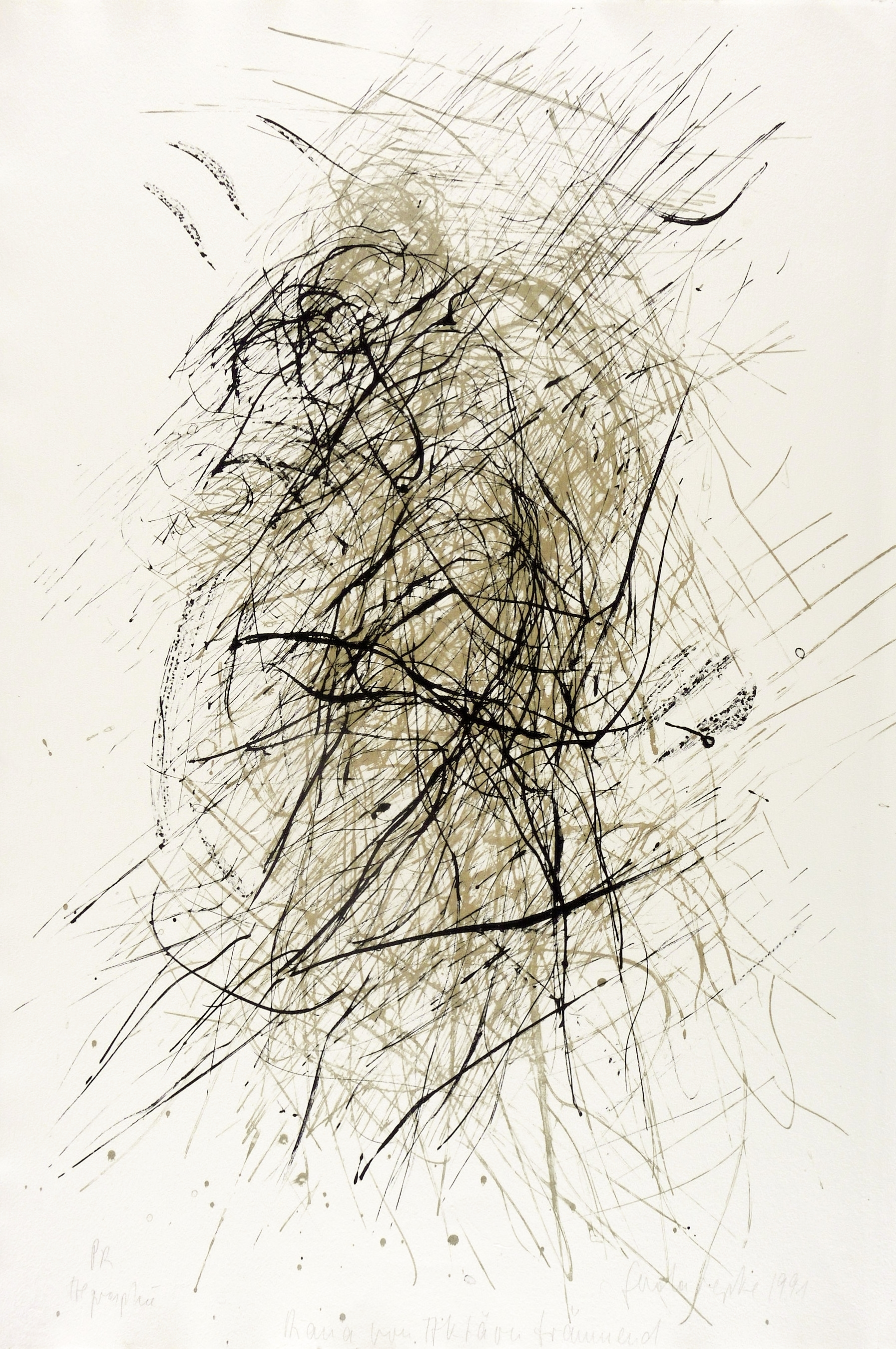 1991. Farbalgrafie / Pinselalgrafie, in Ocker & Schwarz, auf kräftigem hellchamois Hahnemühle. – Originale Künstlergrafik, von Gerda Lepke. – Probedruck. – 80 x 54 cm (Blatt), 76,0 x 52,5 cm (Darstellung / Druckbild).