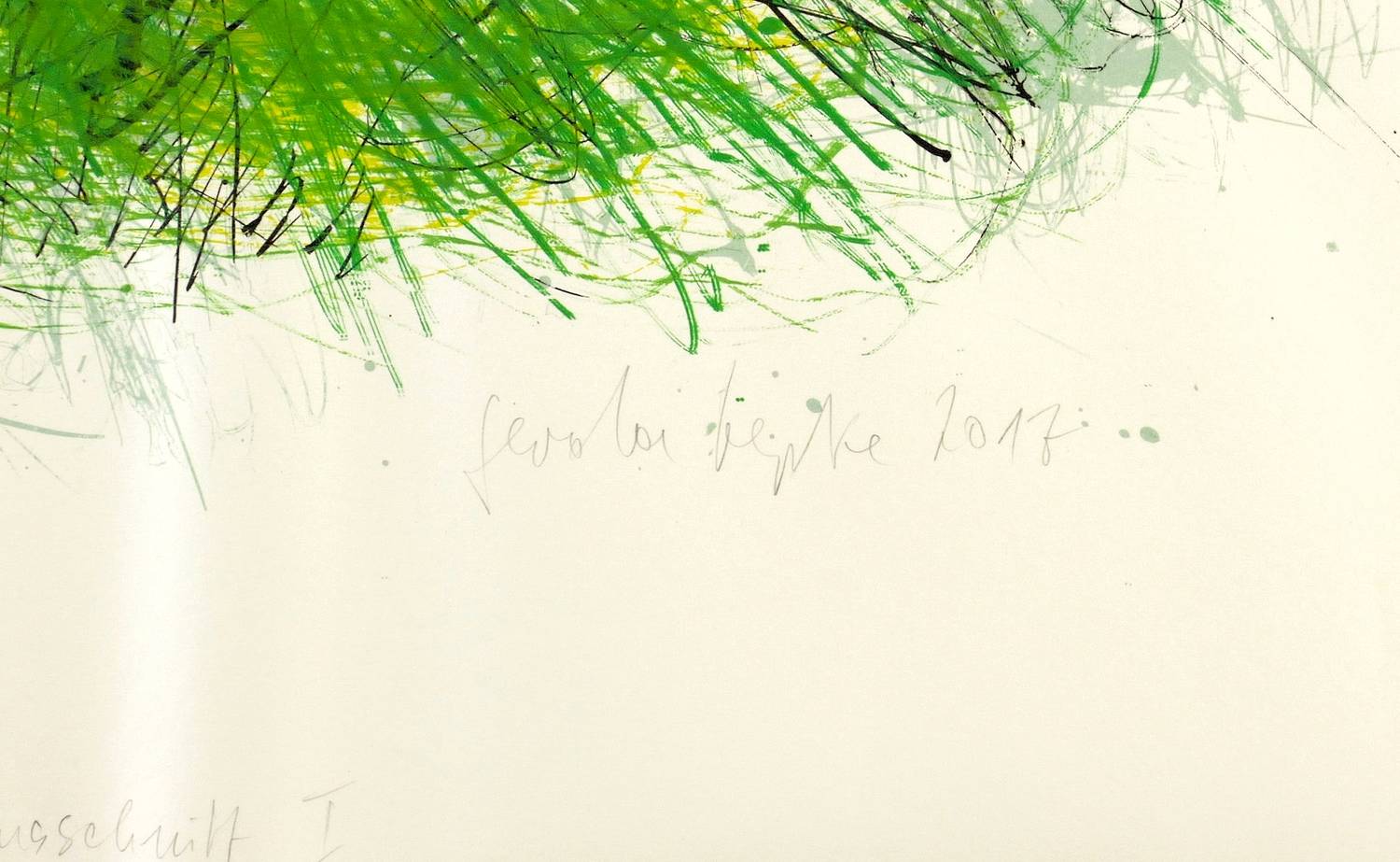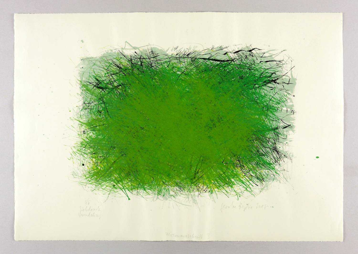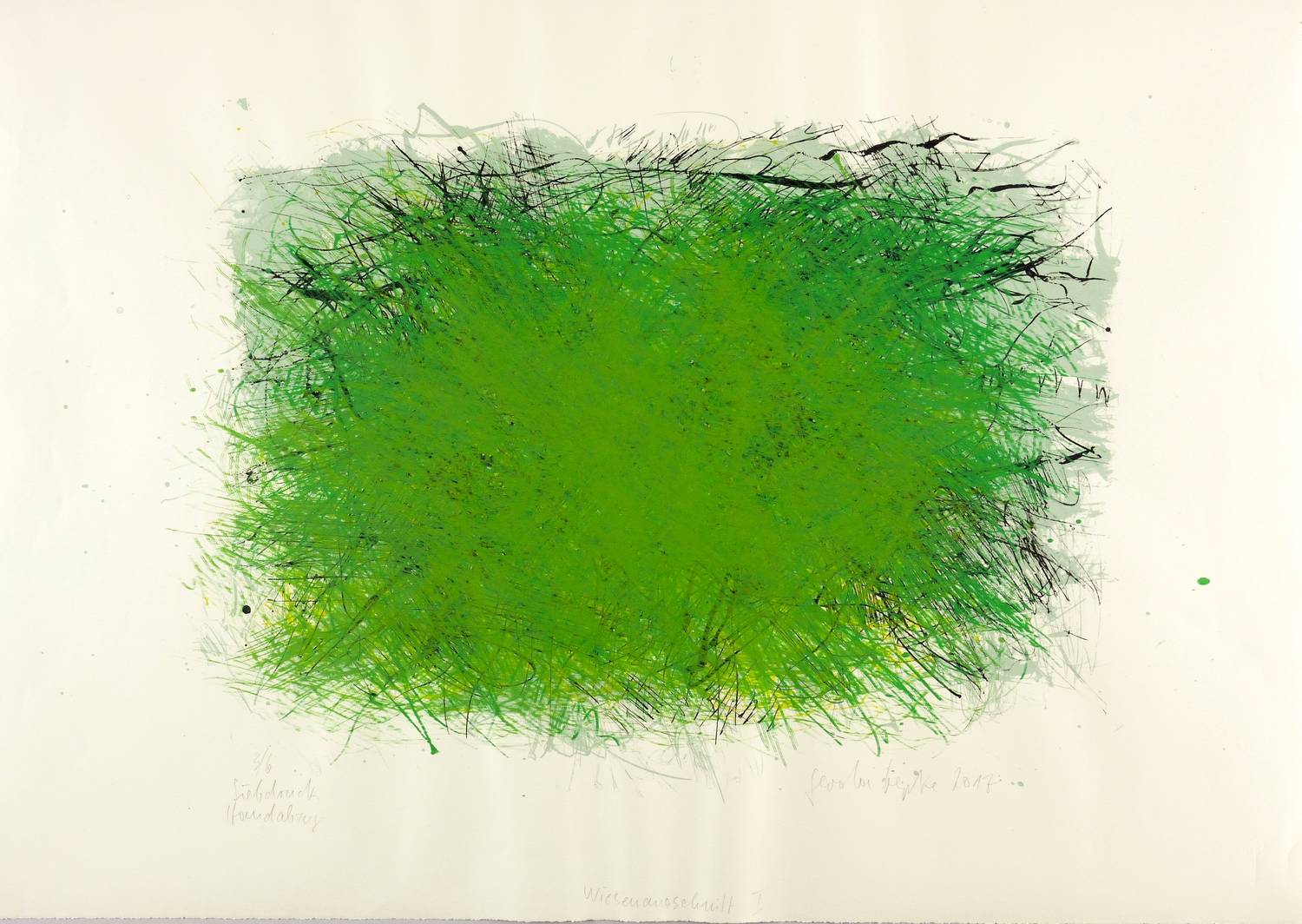 Rechts unten in Bleistift signiert und datiert: ″Gerda Lepke 2017″. Links Auflagen- und Technikbezeichnung: ″3/6 / Siebdruck Handabzug″. Im unteren Blattrand Titel: ″Wiesenausschnitt I″. – Tadellos. Sehr guter Zustand.
