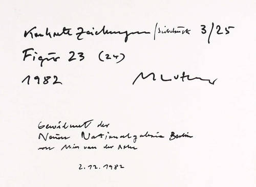Verso in Faserstift signiert und datiert: ″M Luther / 1982″. Dazu Folgentitel, Technik, Auflagenbezeichnung und Folgen-Nr. Weiter Widmung: ″Gewidmet der Neuen Nationalgalerie Berlin von Mies van der Rohe / 2.12.1982″. – Druck von Ekkeland Götze, Dresden. – Figur Nr. 23 aus dem Zyklus ″Siebdrucke Schwarz/Weiß/Grau″, einer Werkgruppe aus dem Hauptwerk ″Idee Konkrete Zeichnungen″ von Manfred Luther. – Ausstellung: ″Manfred Luther. Konkrete Meditationen″ 2024 Galerie Himmel Dresden (Ausst.-Kat. Abb. S. 30). – Sehr guter Zustand.