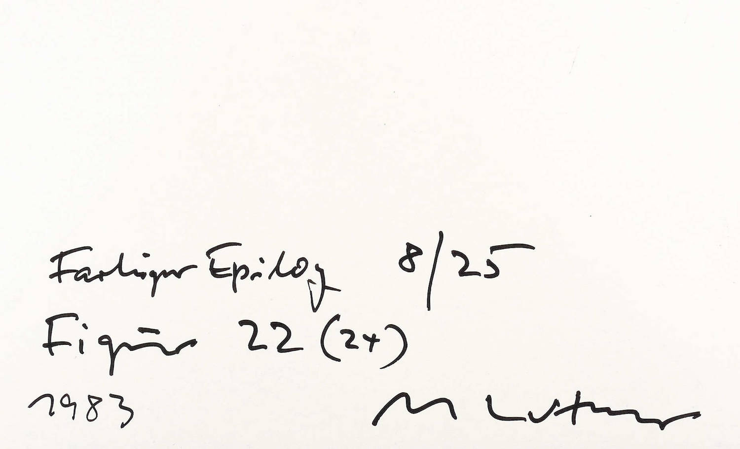 Verso in Faserstift signiert und datiert. Weiter Titel, Auflagenbezeichnung, Folgen-Nr. und Jahr. Dazu Druckersignet. – Druck von Ekkehard Götze, dem bevorzugten Drucker für den Siebdruck u.a. von Hermann Glöckner. – Figur Nr. 22 aus dem Zyklus ″Farbiger Epilog - auf die Erdentage″, einer Werkgruppe aus dem Hauptwerk ″Idee Konkrete Zeichnungen″ von Manfred Luther. – Ausstellung: ″Manfred Luther. Konkrete Meditationen″ 2024 Galerie Himmel Dresden (Ausst.-Kat. Abb. S. 31). – Sehr guter Zustand.