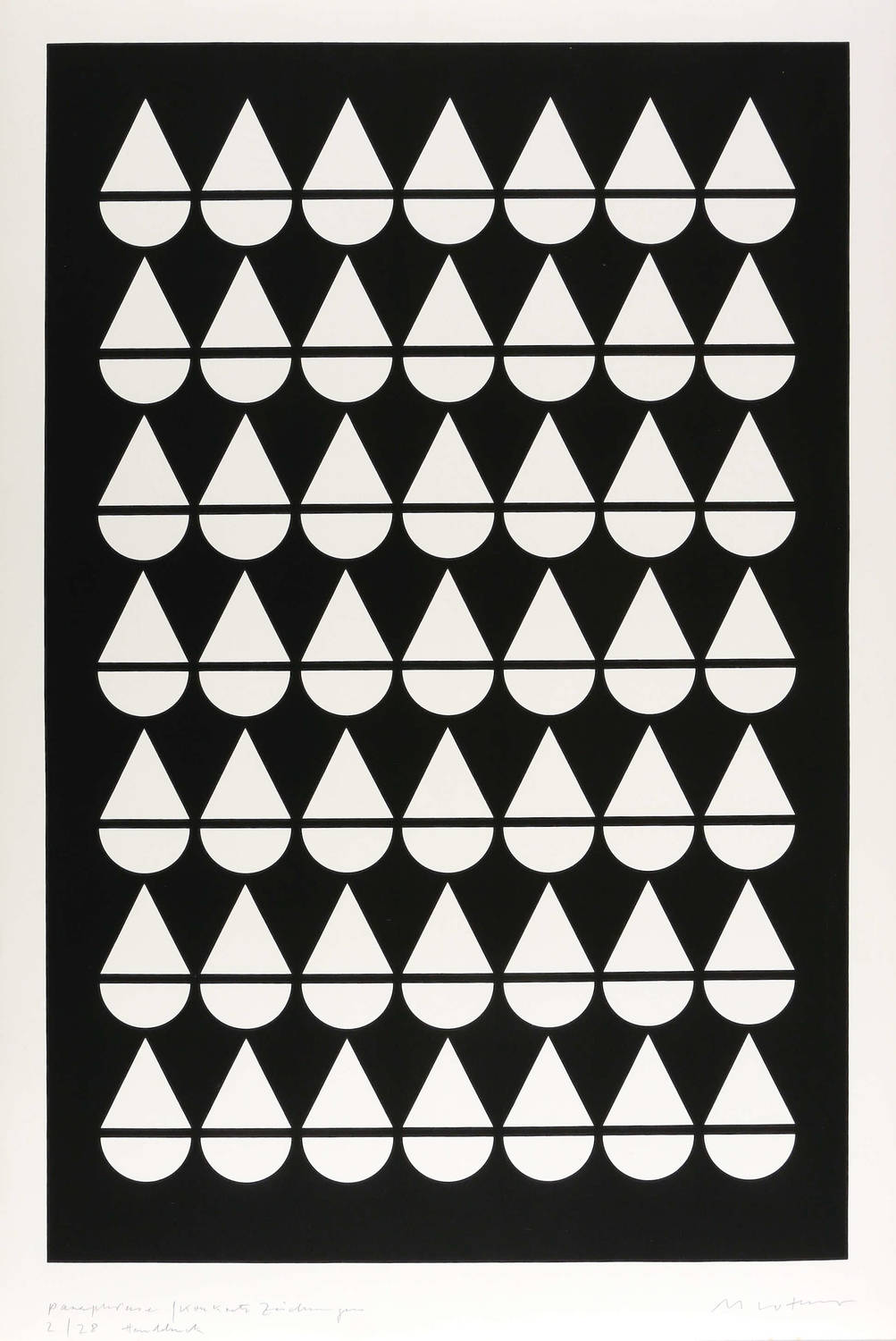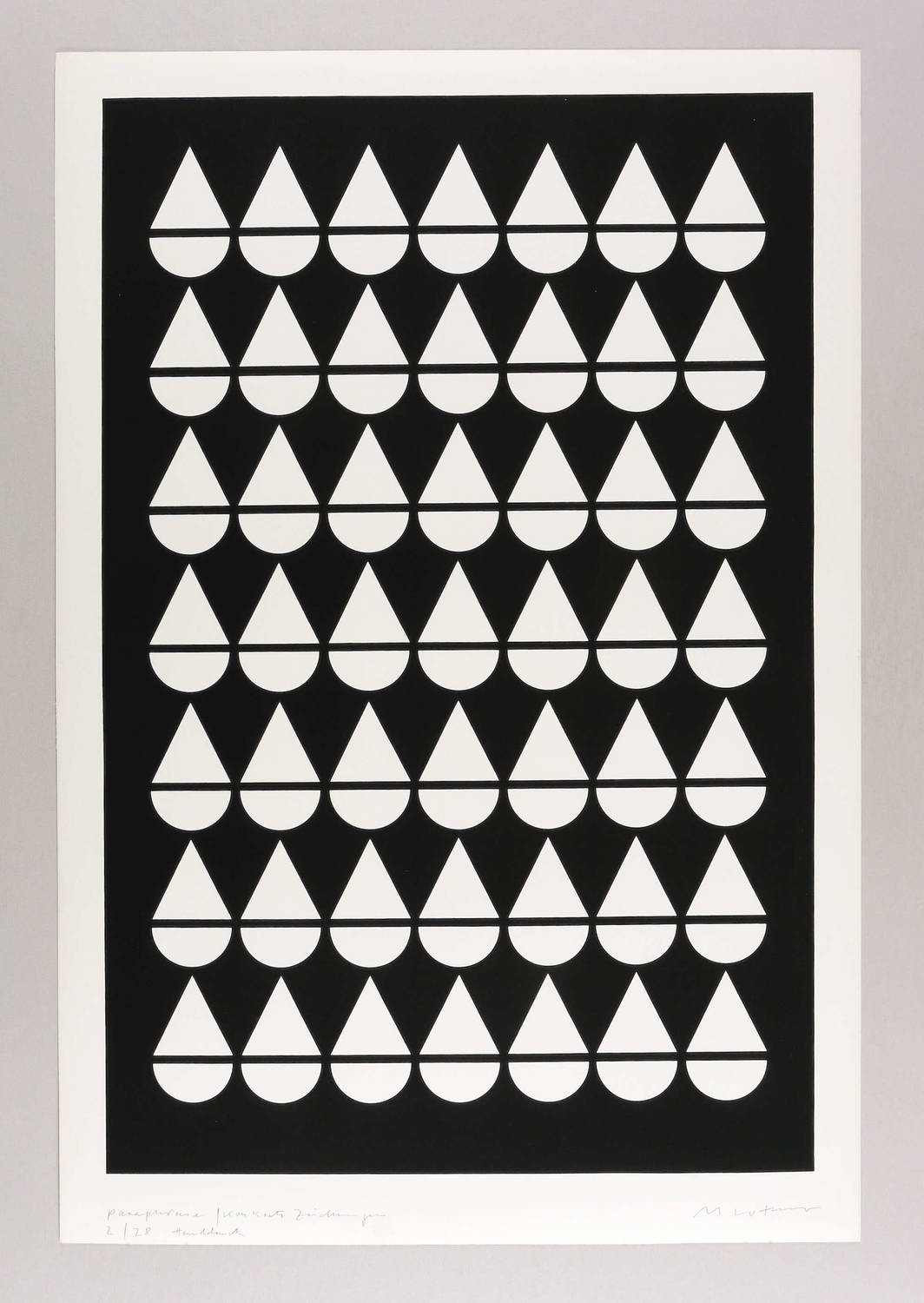 Rechts unten in Bleistift signiert: ″M Luther″. Links Titel und Auflagenbezeichnung. – Handdruck des Künstlers. – Die ″Paraphrasen″ ordnen als Teil der Werkgruppe ″Idee Konkrete Zeichnungen″ deren Formenvokabular neu, um dessen unausschöpfliches Kombinationspotential anzudeuten. – Sehr guter Zustand.