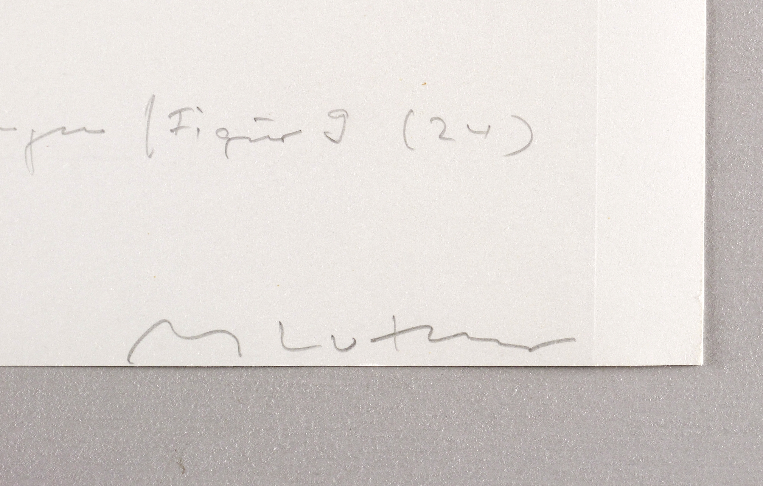 Aus: Graphische Etüden. Grafik-Edition XIII (Leipzig: Reclam 1982). – Verso in Bleistift signiert: ″M Luther″. Dazu eigenhändig bezeichnet bzw. betitelt: ″Konkrete Zeichnungen / Figur 9 (24)″. – Ohne Mängel. Sehr guter Zustand.