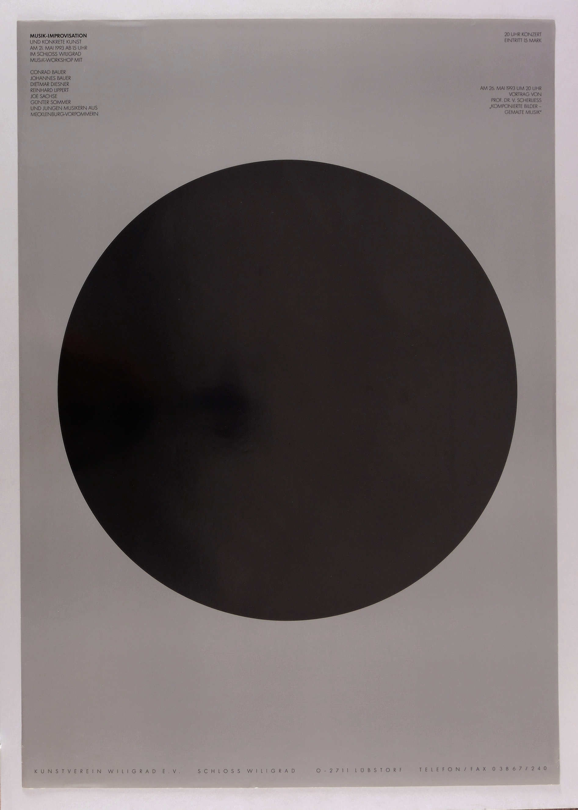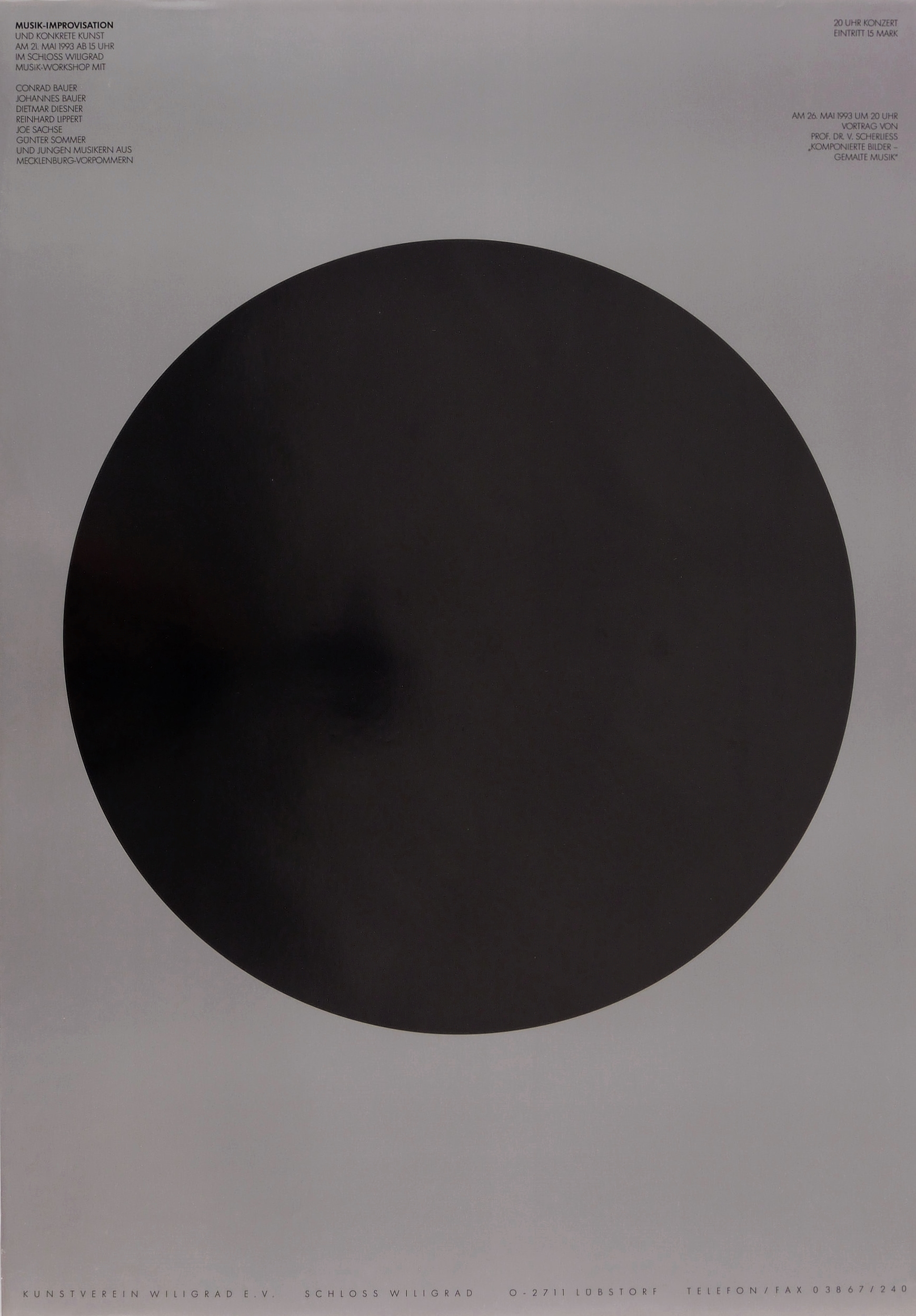 Nicht handsigniert. In der Darstellung Inschrift. – Grafisches Künstler-Plakat zum Musik- Workshop ″Musikimprovisation und konkrete Kunst″ des Kunstvereins Wiligrad e.V. am 21. Mai 1993 im Schloss Wiligrad, Lübstorf. – Minimale Knitterspuren. Insgesamt guter Zustand.