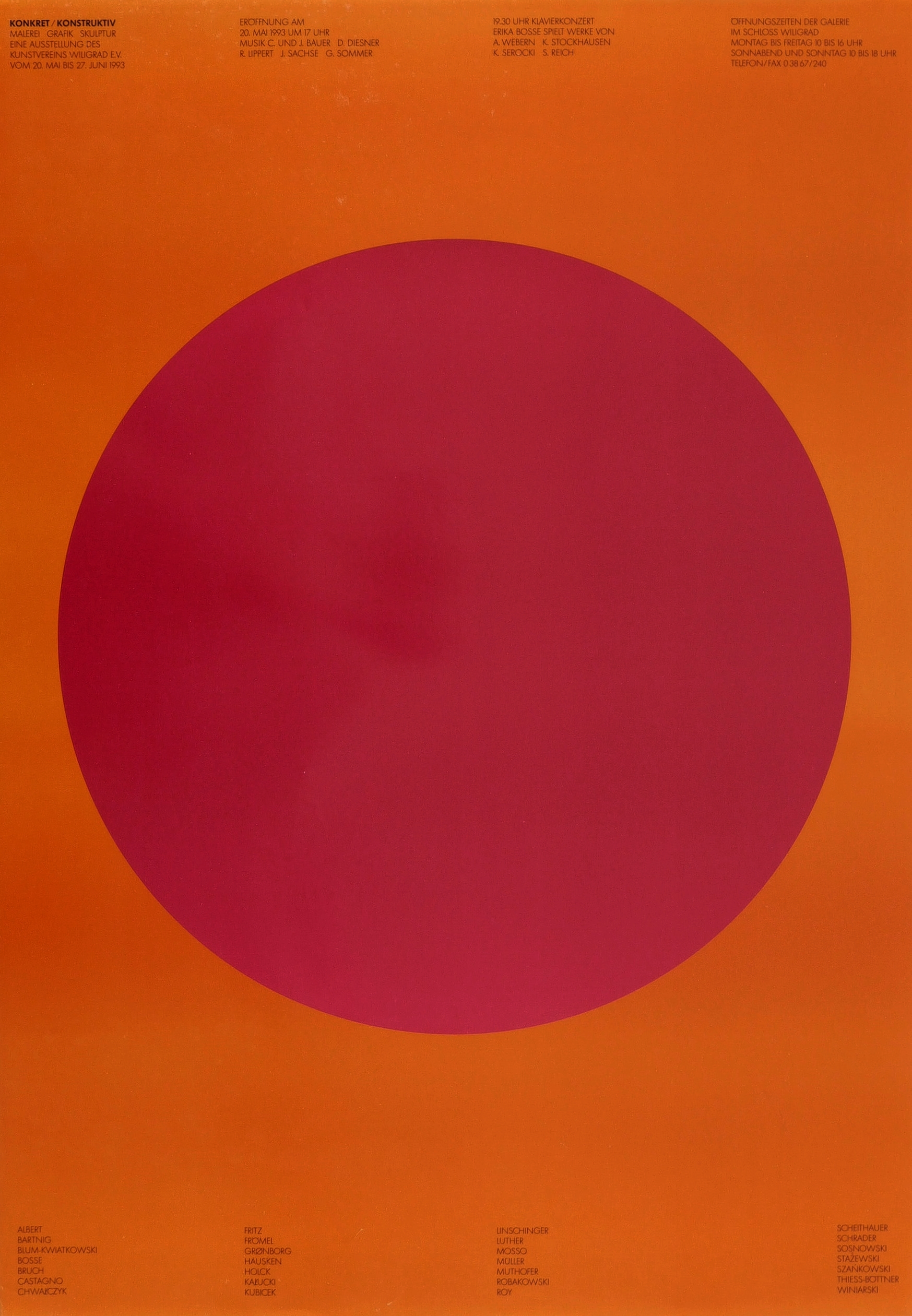 Nicht handsigniert. In der Darstellung Inschrift. – Grafisches Künstler-Plakat zur Ausstellung ″KONKRET / KONSTRUKTIV″ des Kunstvereins Wiligrad e.V. 20.5.-27.6.1993 im Schloss Wiligrad, Lübstorf. – Minimale Knitterspuren. Insgesamt guter Zustand.