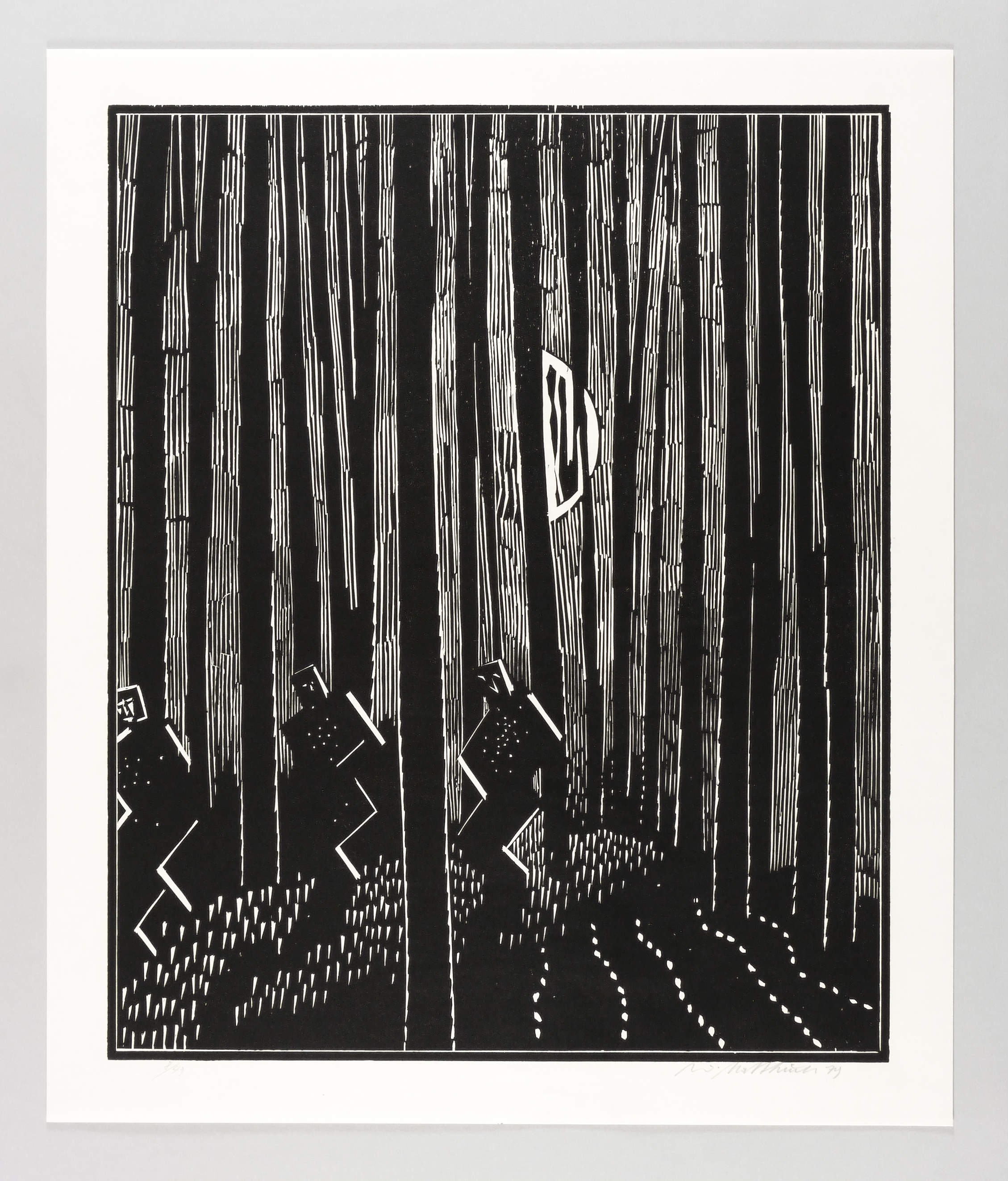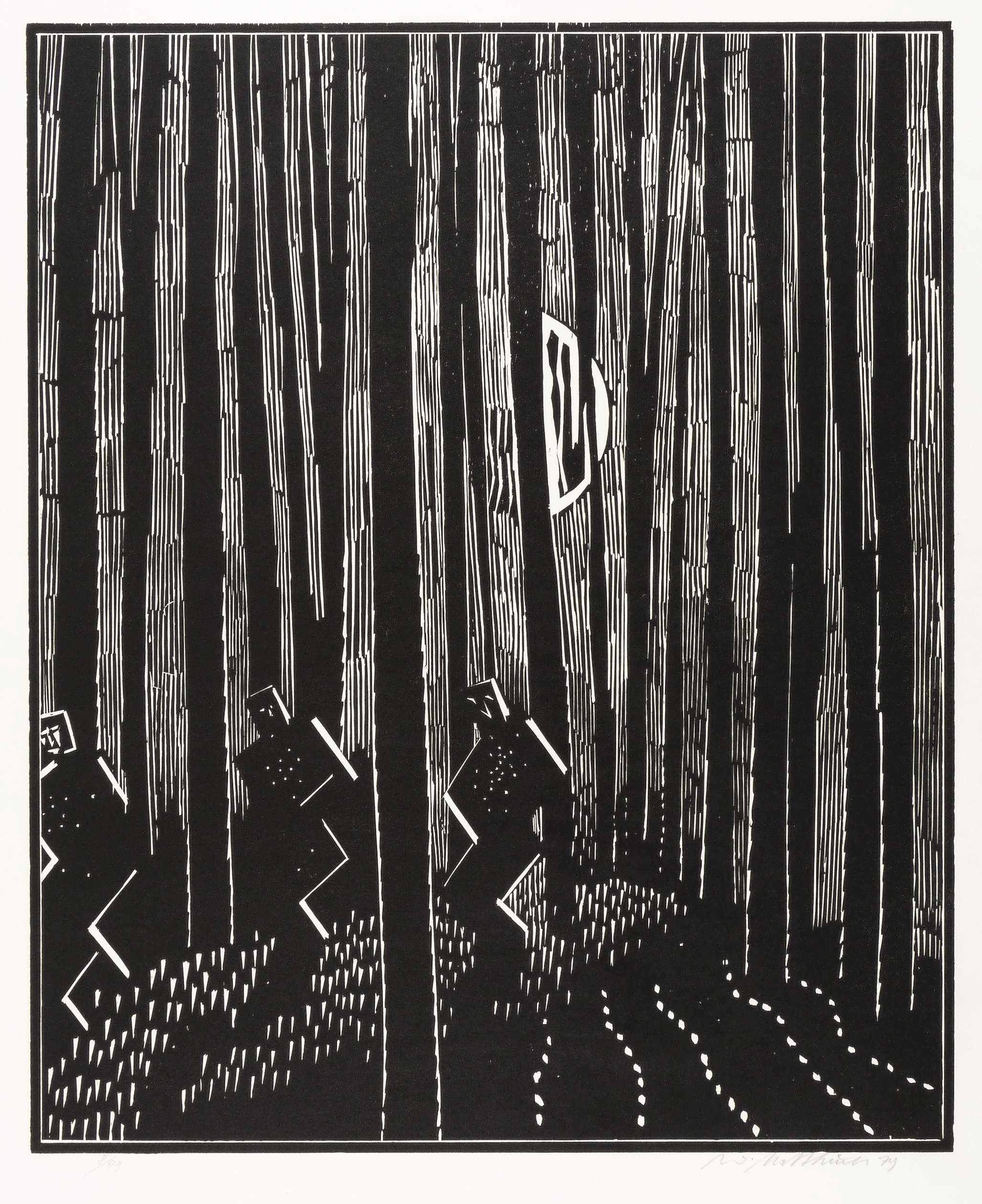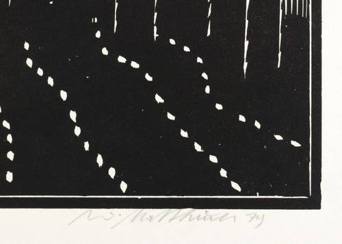 1979. Holzschnitt, in Schwarz, auf rauem weißem Velin. – Originale Künstlergrafik, von Wolfgang Mattheuer. – Auflage Exemplar Nr. 8/49. – 55,0 x 44,9 cm (Darstellung / Druckbild), 62 x 52 cm (Blatt).