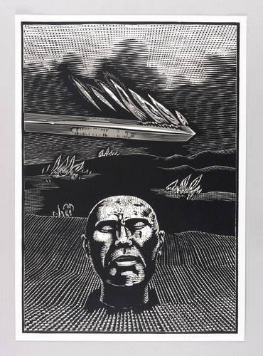 1974. Farbholzschnitt / Clair-obscure, in 2 Farben, auf weißem Velin. – Originale Künstlergrafik, von Wolfgang Mattheuer. – Auflage Exemplar Nr. 12/150. – 46,0 x 32,0 cm (Darstellung / Druckstock), 48 x 34 cm (Blatt).