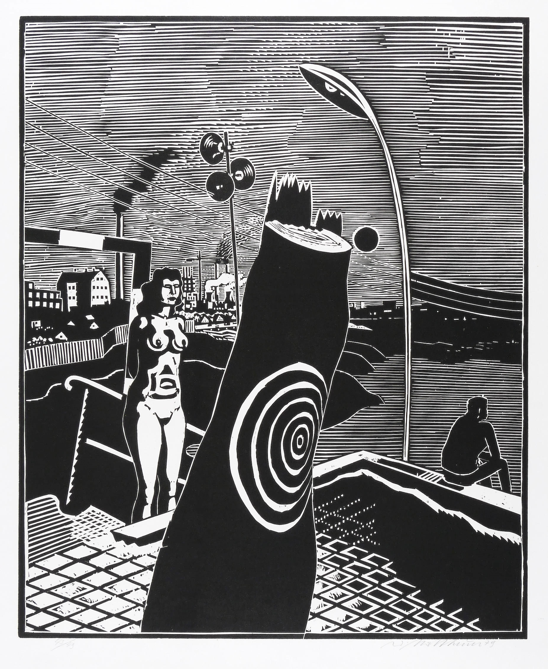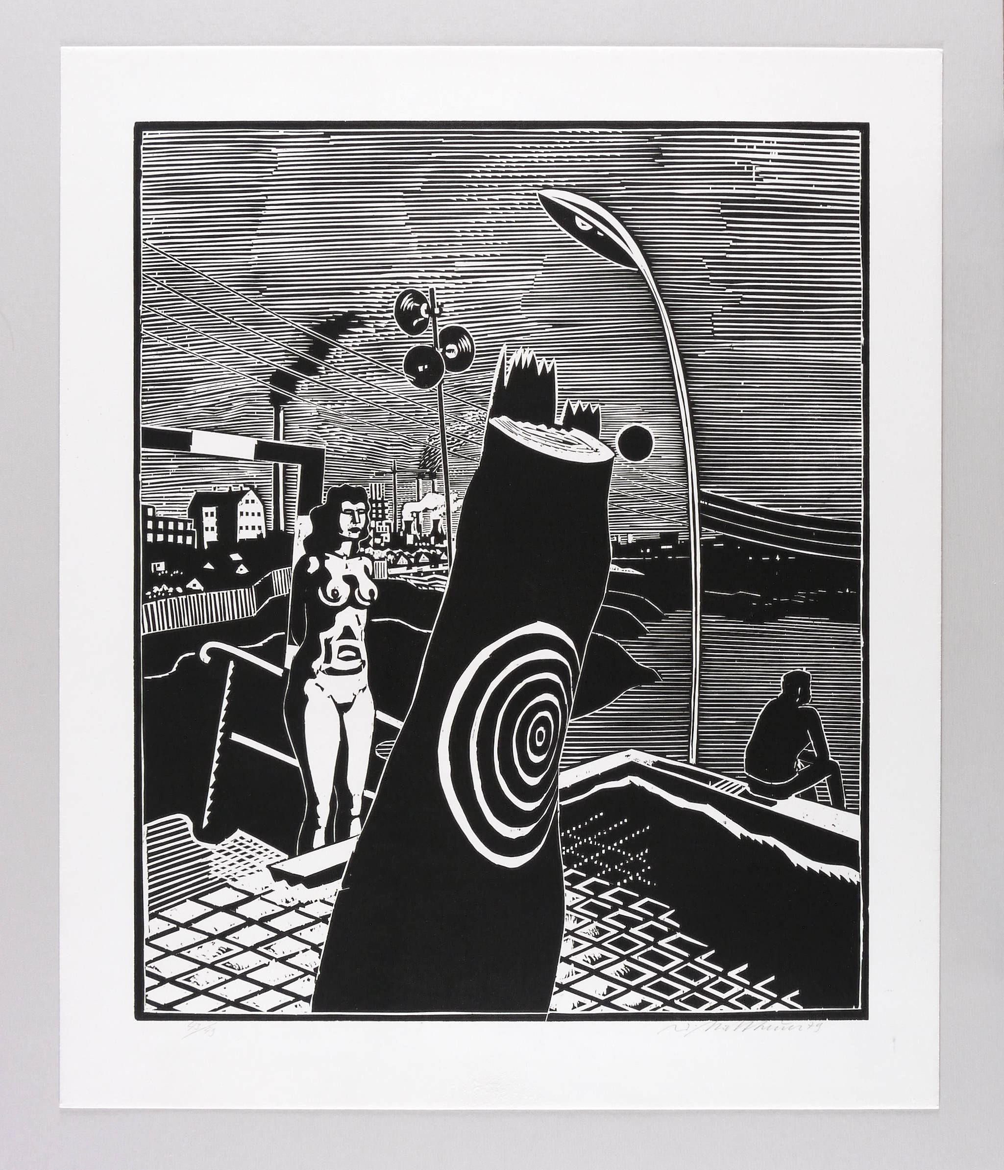 1979. Holzschnitt, in Schwarz, auf rauem weißem Velin. – Originale Künstlergrafik, von Wolfgang Mattheuer. – Auflage Exemplar Nr. 43/49. – 55,2 x 45,2 cm (Darstellung / Druckbild), 65 x 54 cm (Blatt).