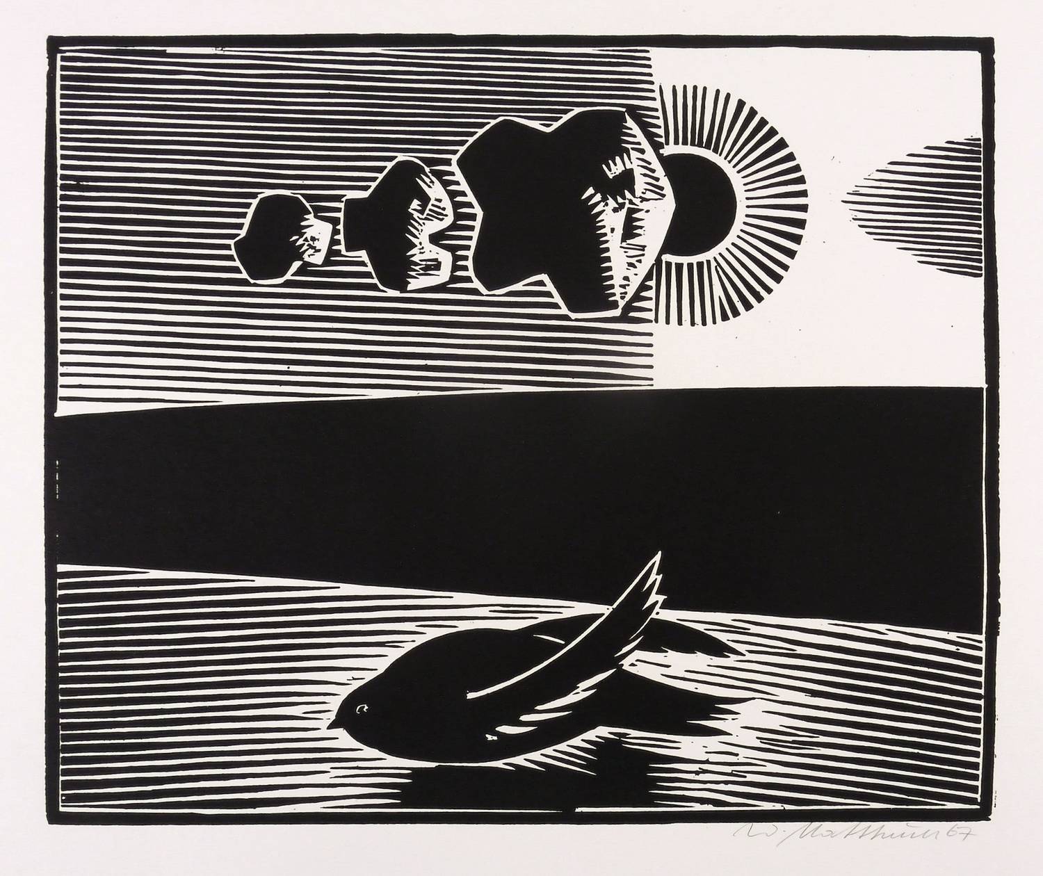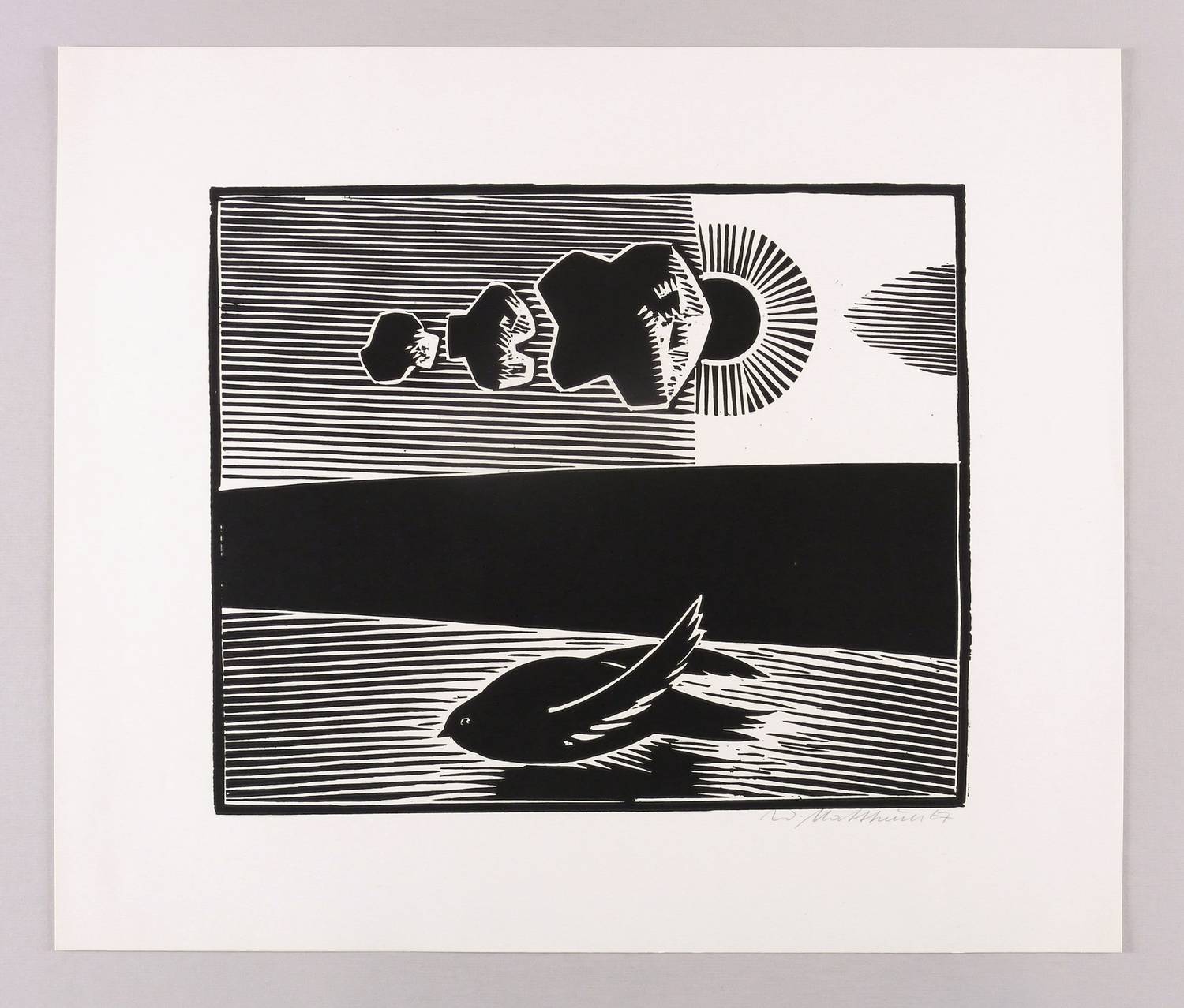 1967. Holzschnitt, in Schwarz, auf glattem hellchamois Velin. – Originale Künstlergrafik, von Wolfgang Mattheuer. – 31,9 x 38,5 cm (Darstellung / Druckstock), 47 x 55 cm (Blatt).