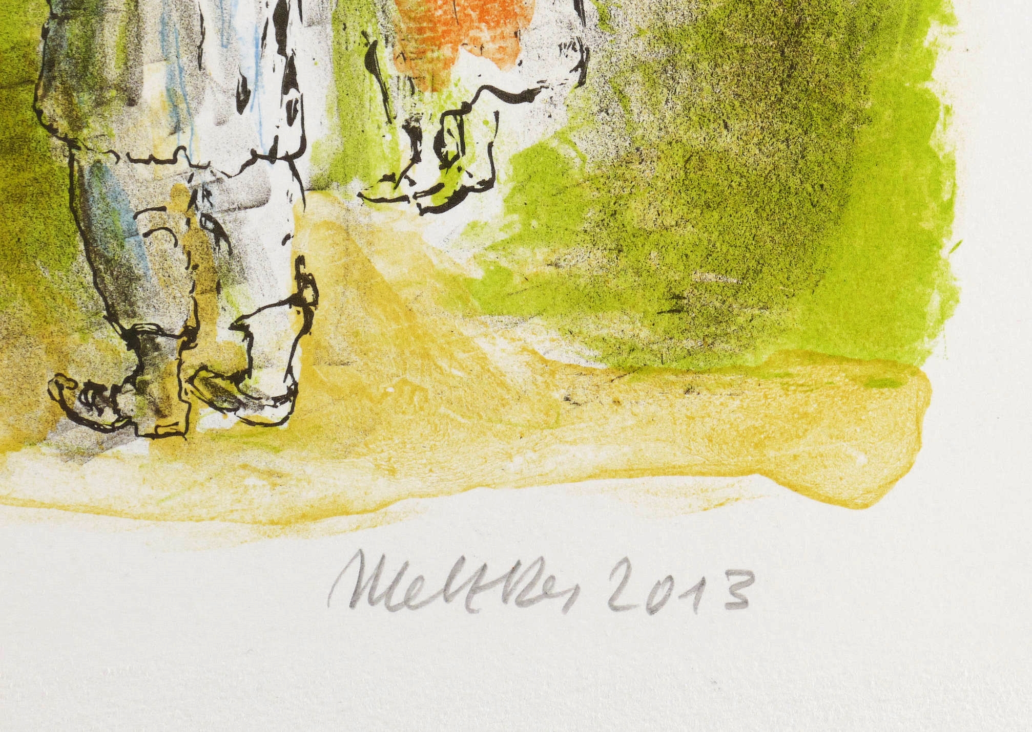 2013. Farblithografie / Pinsellithografie, in 6 Farben, auf hellem Velinkarton. – Originale Künstlergrafik, von Harald Metzkes. – Auflage Exemplar Nr. 49/50. – 34,4 x 43,2 cm (Darstellung / Druckbild), 50 x 60 cm (Blatt).