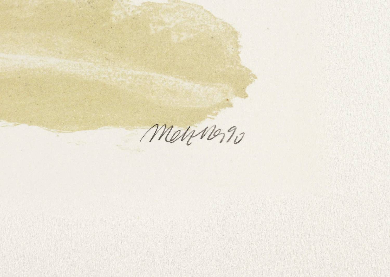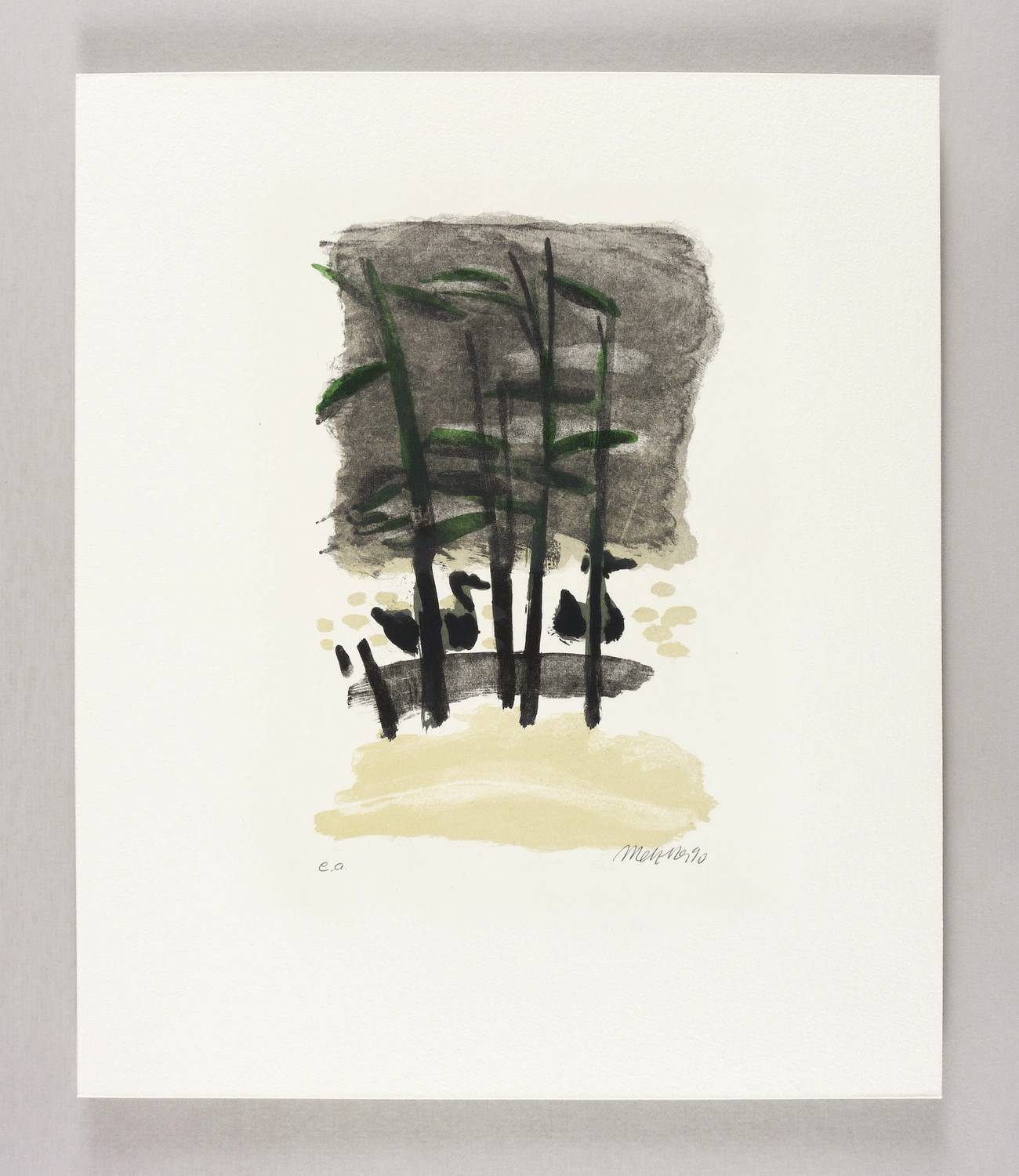 1990. Farblithografie / Pinsellithografie, in 4 Farben, auf festem hellchamois Velin. – Originale Künstlergrafik, von Harald Metzkes. – Künstlerexemplar (e.a.). – 22,5 x 14,5 cm (Darstellung / Druckbild), 36 x 30 cm (Blatt).