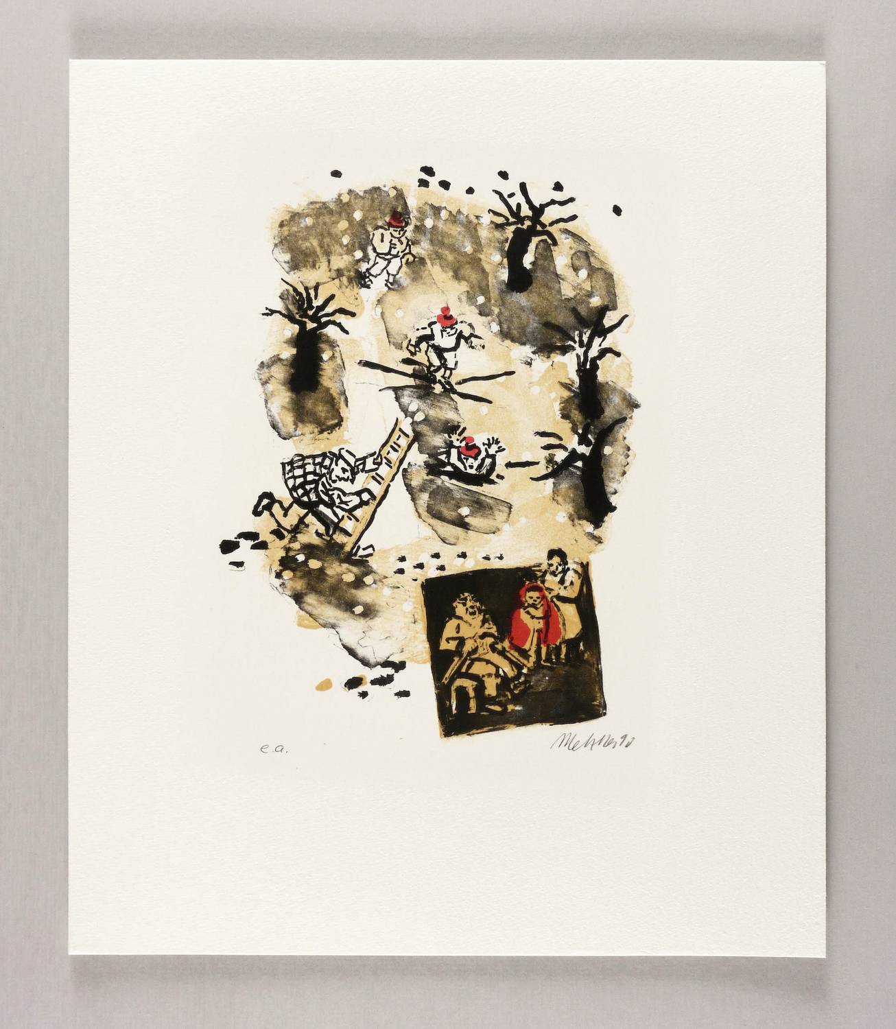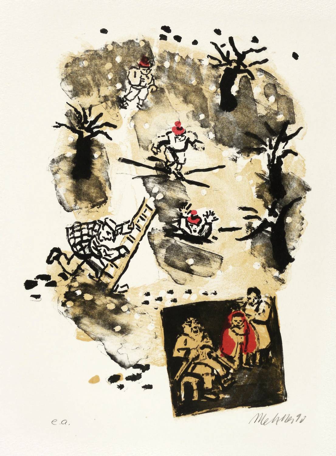 Rechts unten in Bleistift signiert und datiert: ″Metzkes 90″. Links Auflagenbezeichnung. Verso fremd bezeichnet. – Zu dem Wintergedicht ″Will sehen, was ich weiß, vom Büblein auf dem Eis″ von Friedrich Güll: ″Gefroren hat es heuer / noch gar kein festes Eis / Das Büblein steht am Weiher / und spricht zu sich ganz leis: / 'Ich will es einmal wagen / das Eis, es muss doch tragen / Wer weiß?' // Das Büblein stapft und hacket / mit seinem Stiefelein / Das Eis auf einmal knacket / und krach! schon bricht´s hinein. / Das Büblein platscht und krabbelt / als wie ein Krebs und zappelt / mit Arm und Bein. // 'O helft, ich muss versinken / in lauter Eis und Schnee / O helft, ich muss ertrinken / im tiefen, tiefen See' / Wär nicht ein Mann gekommen – / der sich ein Herz genommen / o weh! // Der packt es bei dem Schopfe / und zieht es dann heraus / vom Fuße bis zum Kopfe / wie eine Wassermaus / Das Büblein hat getropfet, / der Vater hat´s geklopfet / zu Haus.″ – Ohne Mängel. Sehr guter Zustand.