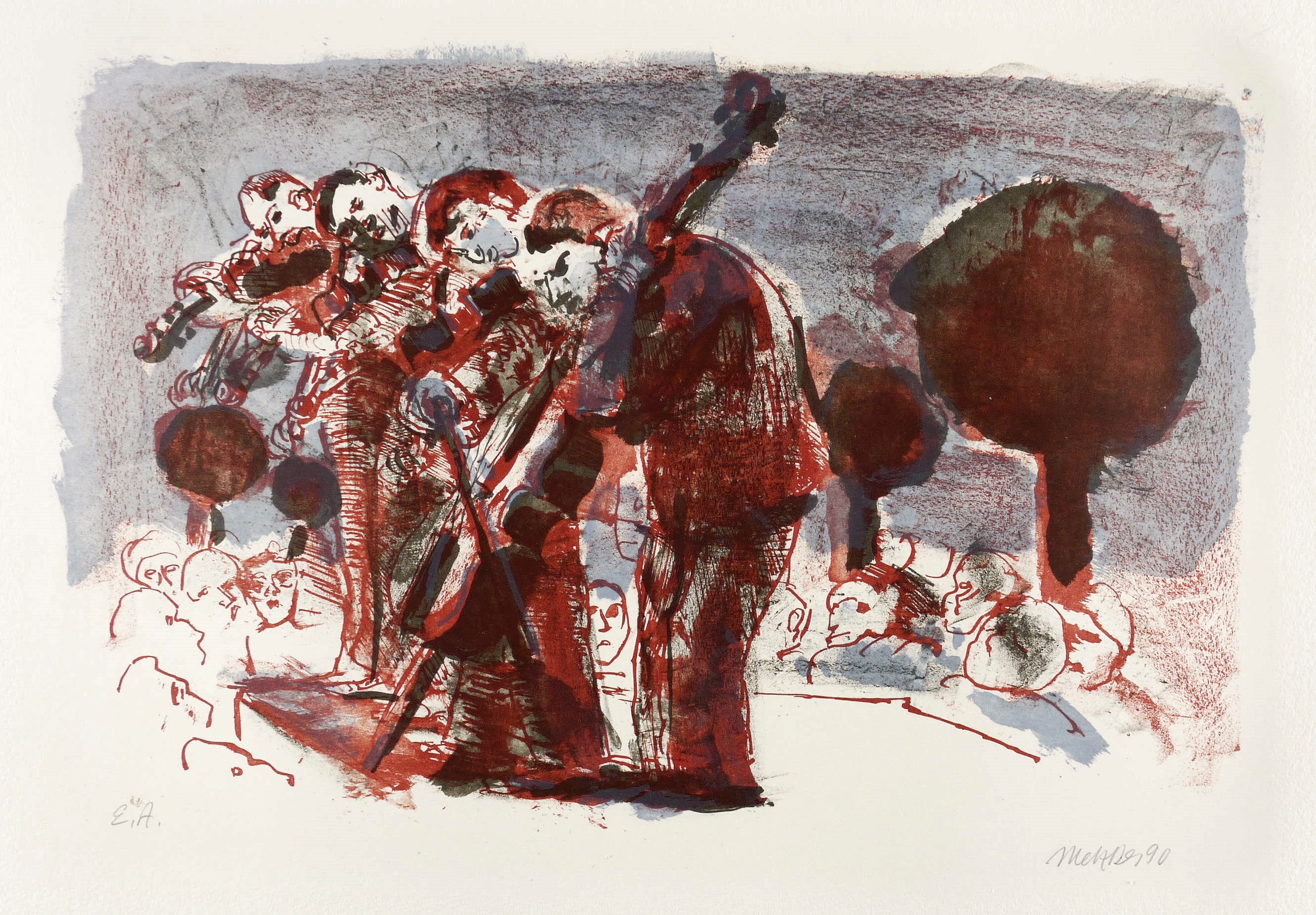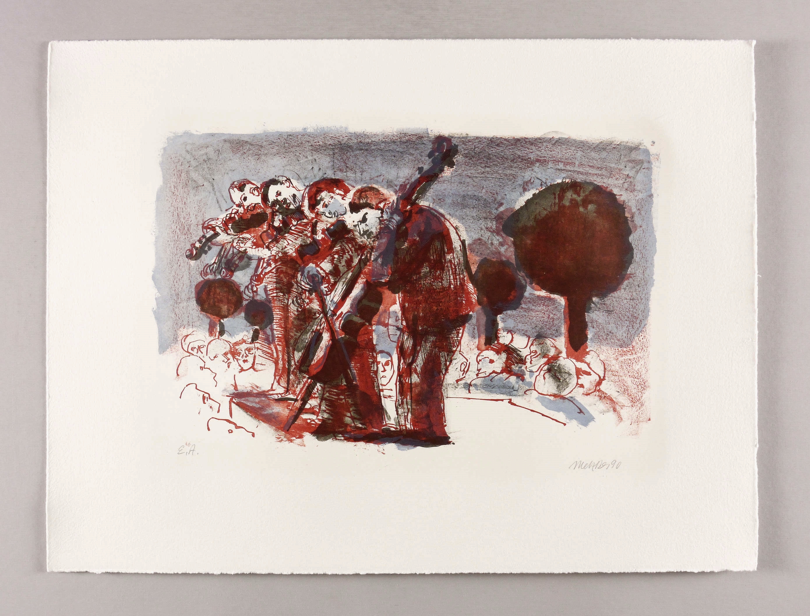 1990. Farblithografie / Pinsellithografie, in 4 Farben, auf schwerem hellchamois Hahnemühle. – Originale Künstlergrafik, von Harald Metzkes. – Künstlerexemplar (e.a.). – 24,6 x 37,8 cm (Darstellung / Druckbild), 40 x 53 cm (Blatt).