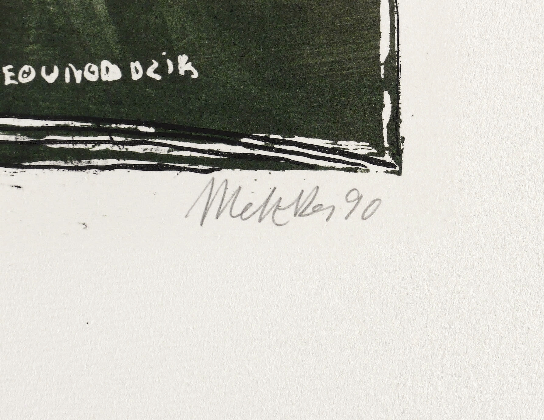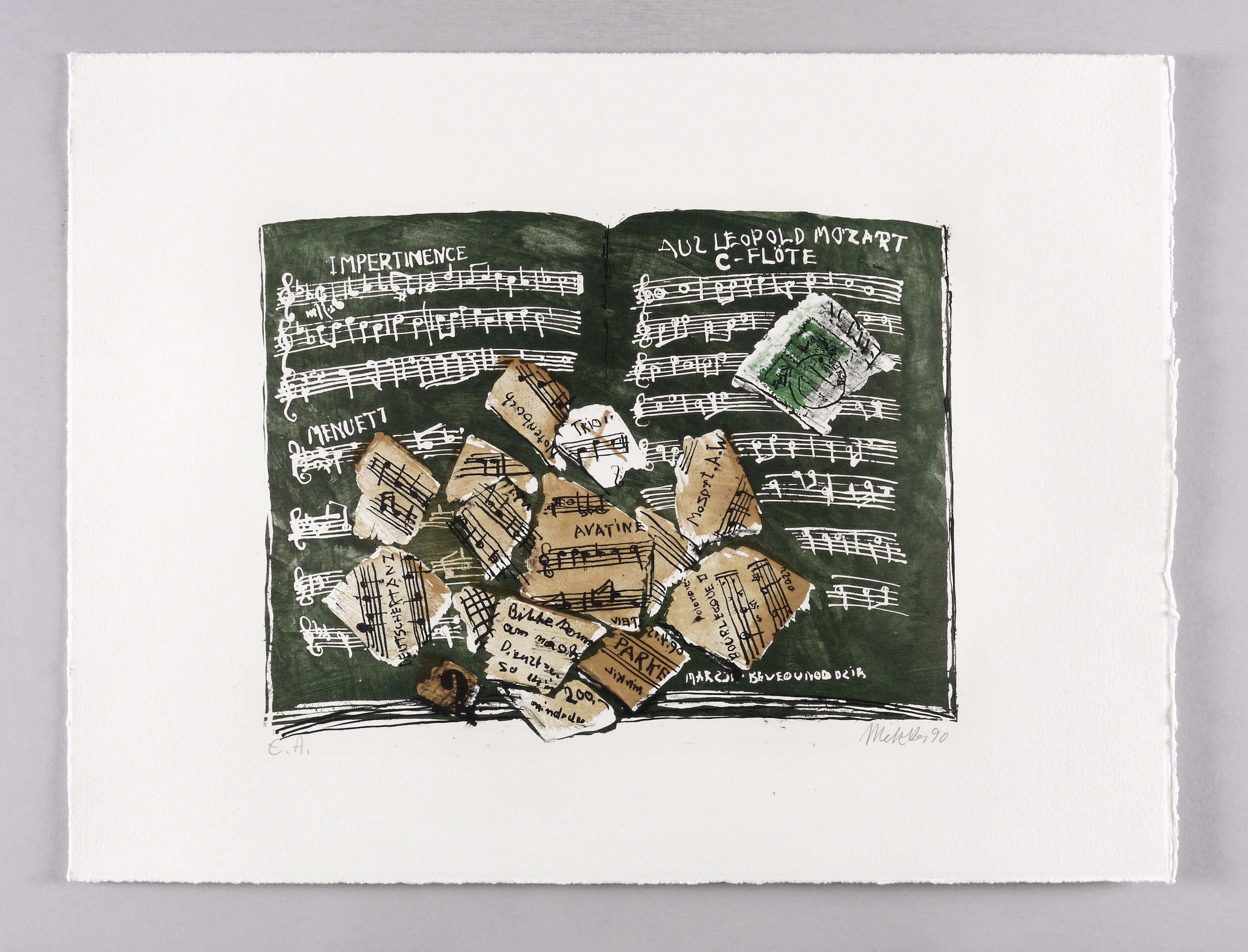 Rechts unten in Bleistift signiert und datiert: ″Metzkes 90″. Links Auflagenbezeichnung. Im Stein zahlreiche Inschriften, u.a.: ″IMPERTINENCE // AUS LEOPOLD MOZART / C-FLÖTE // MENUET // (...)″. – Ohne Mängel. Sehr guter Zustand.