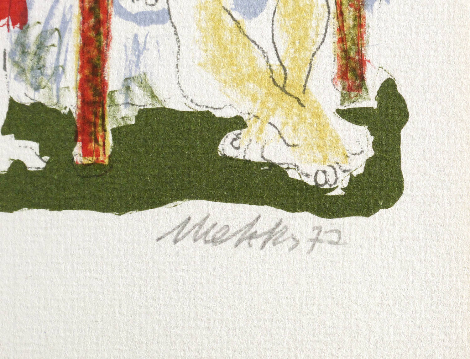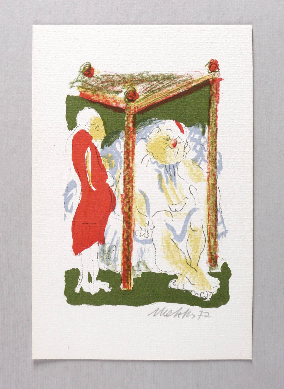 1977. Farblithografie / Kreidelithografie, in 4 Farben, auf hartem hellchamois Maschinenbütten. – Originale Künstlergrafik, von Harald Metzkes. – 15,7 x 10,5 cm (Darstellung), 21 x 14 cm (Blatt).