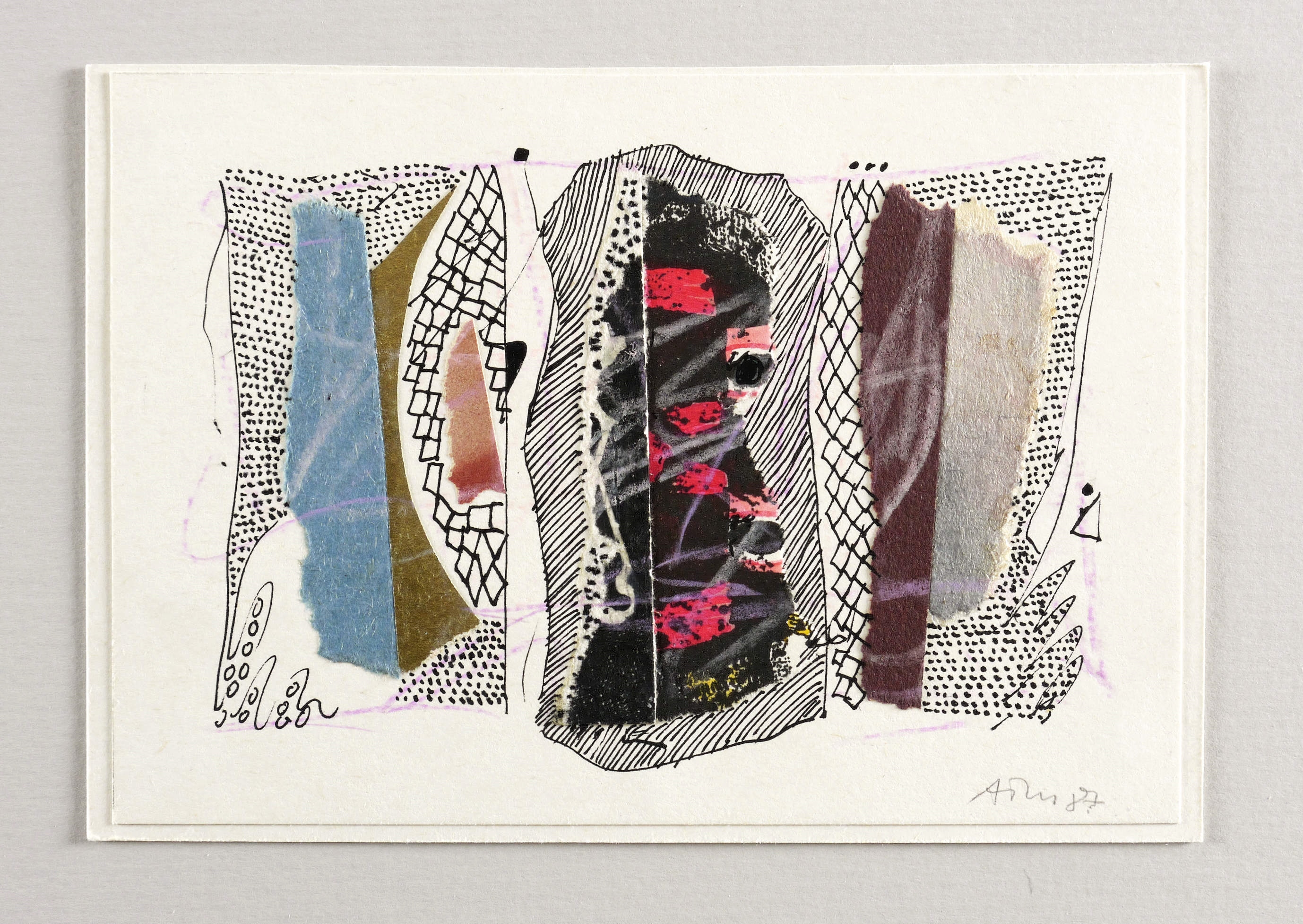 1987. Mischtechnik / Papiercollage, Tusche & Farbstift, auf weißem Karton. – Originale Künstlergrafik, von Alfred Traugott Mörstedt. – Unikat. – 8,4 x 12,3 cm (Darstellung), 10,0 x 14,3 cm (Blatt), 10,5 x 15,0 cm (Trägerkarton).
