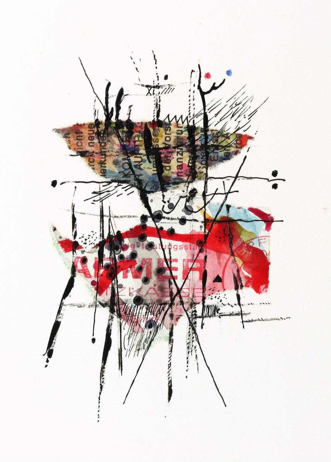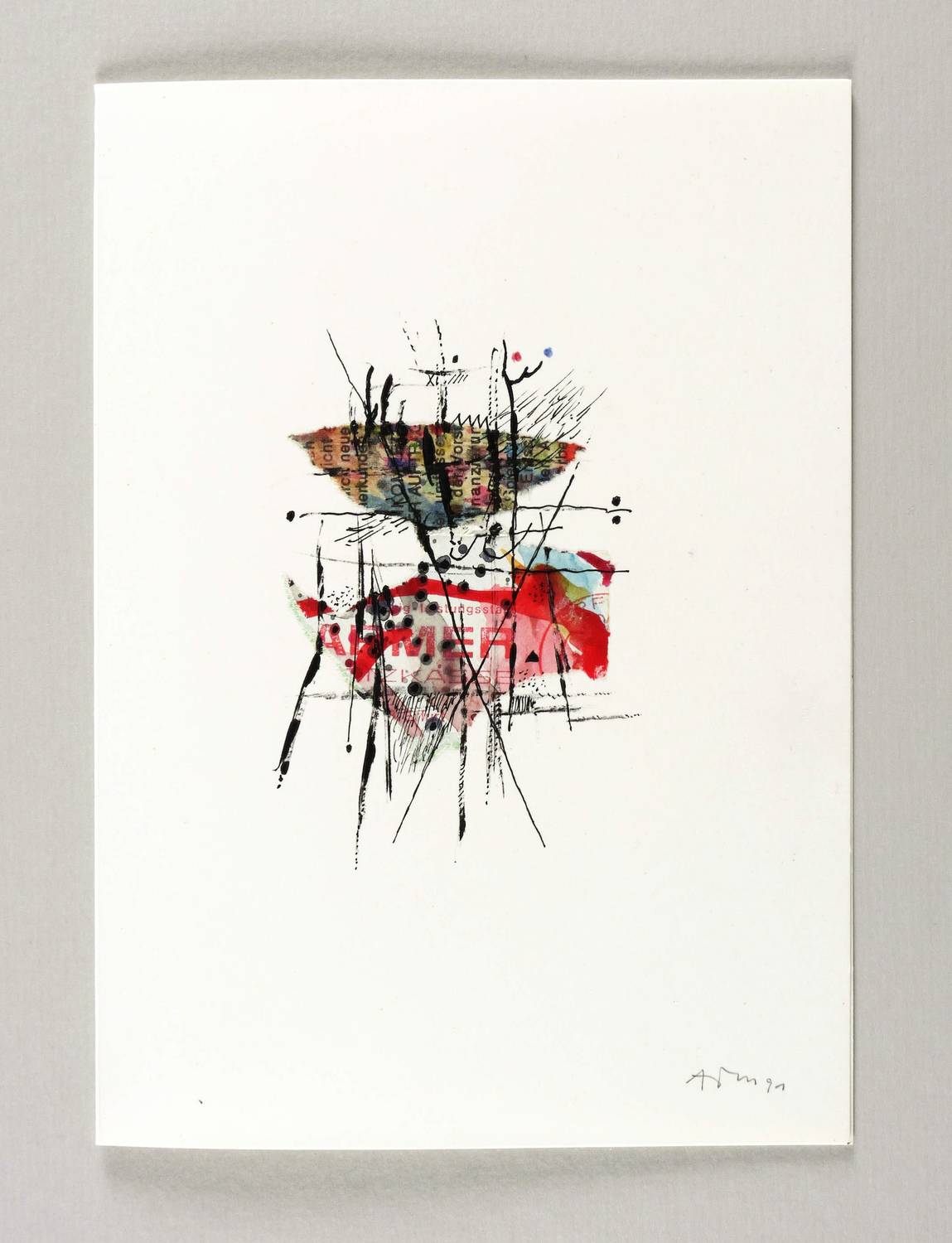 1991. Mischtechnik / Papiercollage, Aquarell & Tusche, auf glattem weißem Karton. – Von Alfred Traugott Mörstedt. – 10,8 x 7,0 cm (Darstellung / Blatt), 21 x 15 cm (Trägerkarton).