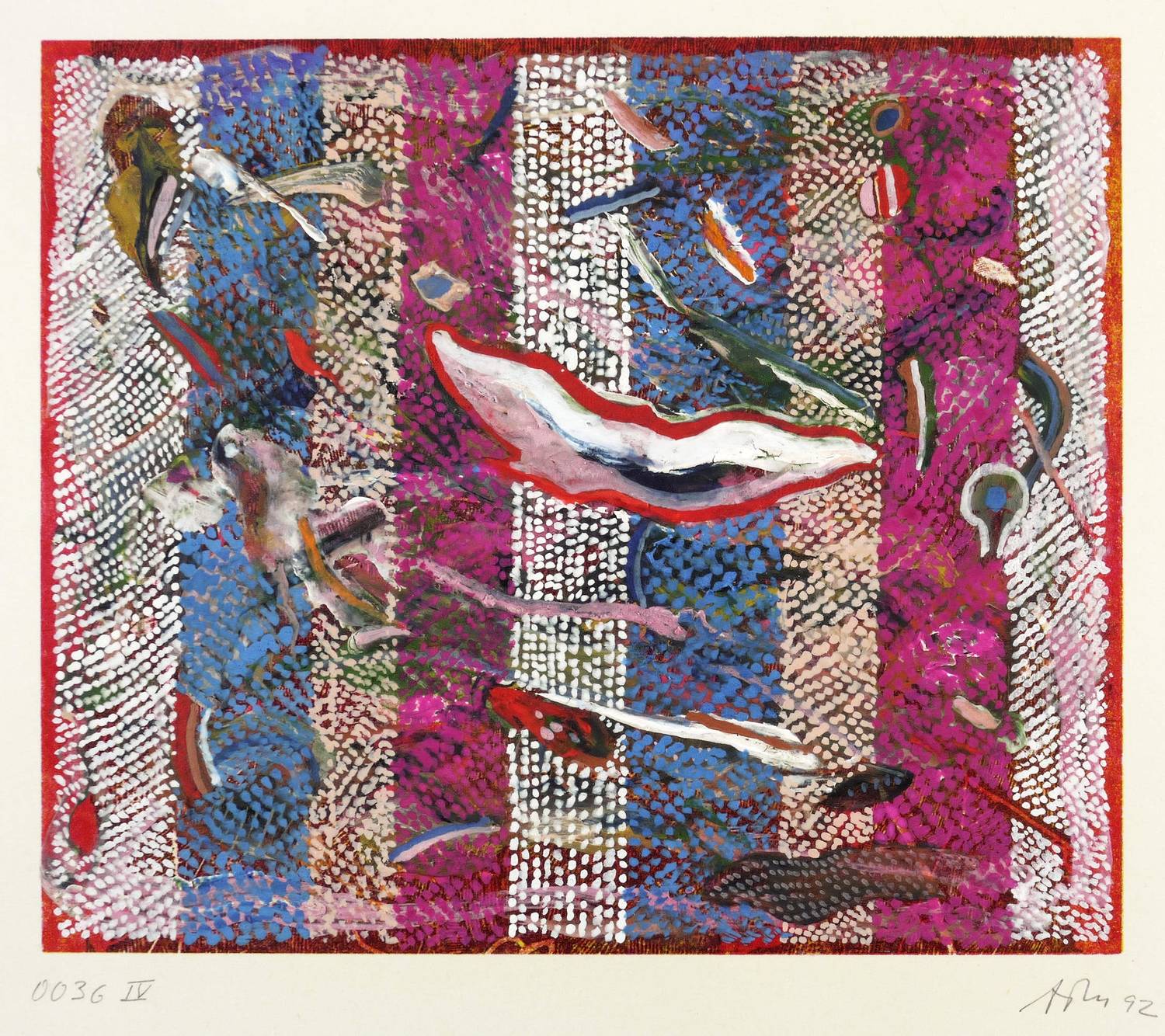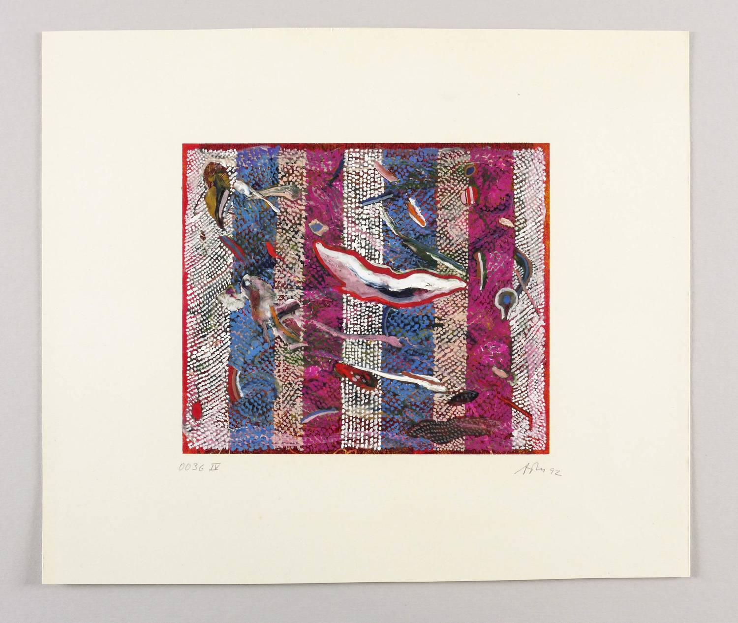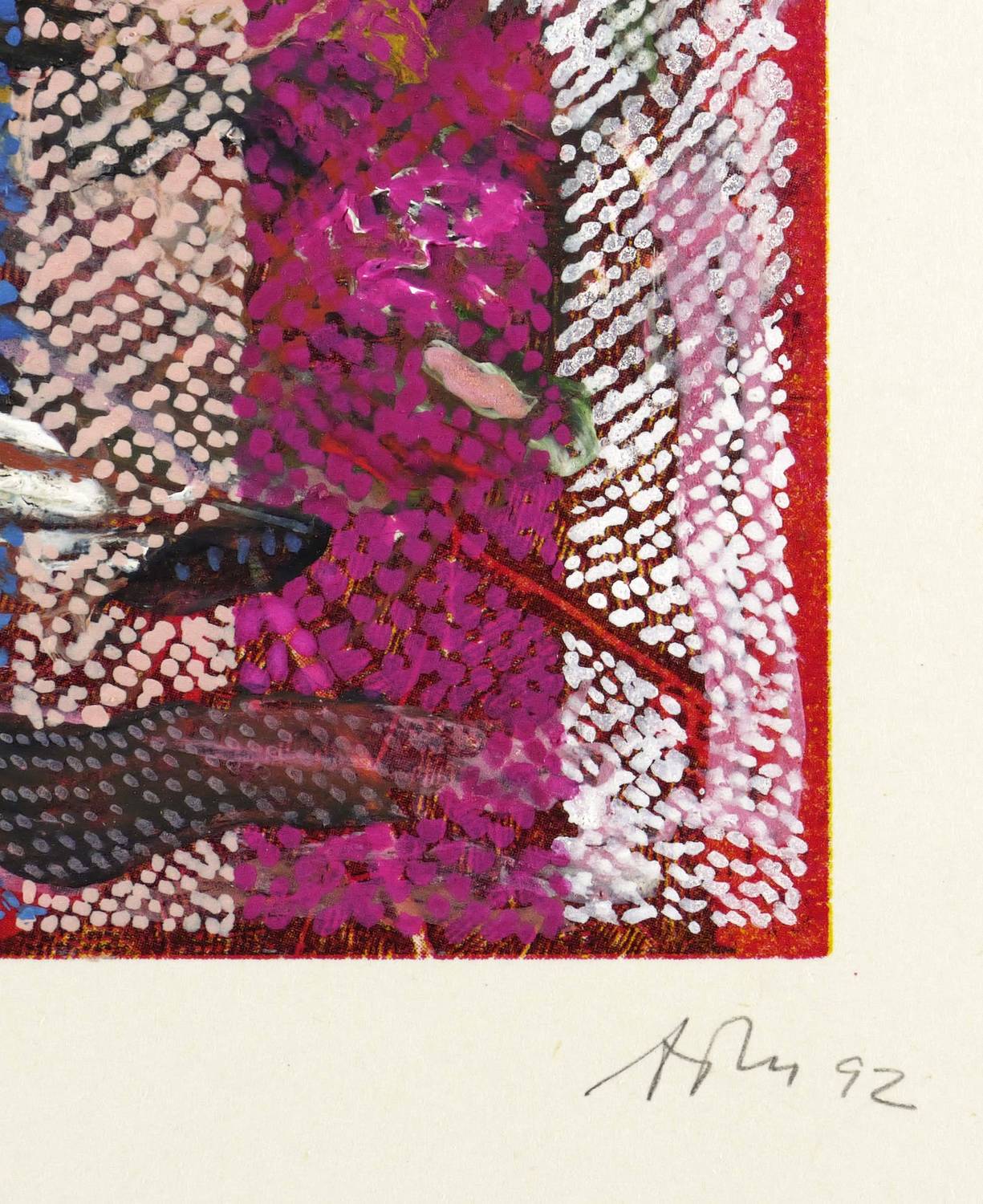 Rechts unten in Bleistift signiert und datiert: ″ATM 92″. Links Werk-Nr.: ″0036 IV″. Verso nochmals Werk-Nr., dazu Titel: ″ENTSTEHUNGSGESCHICHTEN″. – Unikat. – Rückseitig Montagespuren. Sonst ohne Mangel. Guter Zustand.